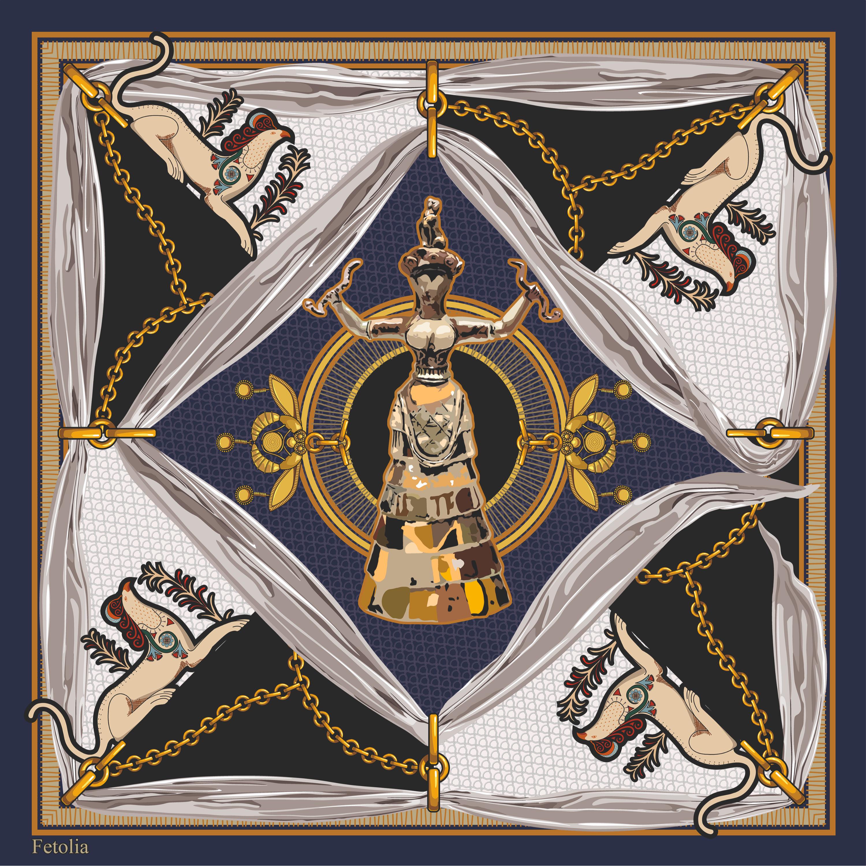 În acest design unic puteți găsi Zeița minoică a șerpilor. Două figurine similare au fost descoperite la începutul anilor 1900 pe insula greacă Creta. Această figurină veche de 3.500 de ani înfățișează o femeie cu sânii goi, ținând un șarpe în fiecare dintre mâinile ridicate și o felină pe cap.