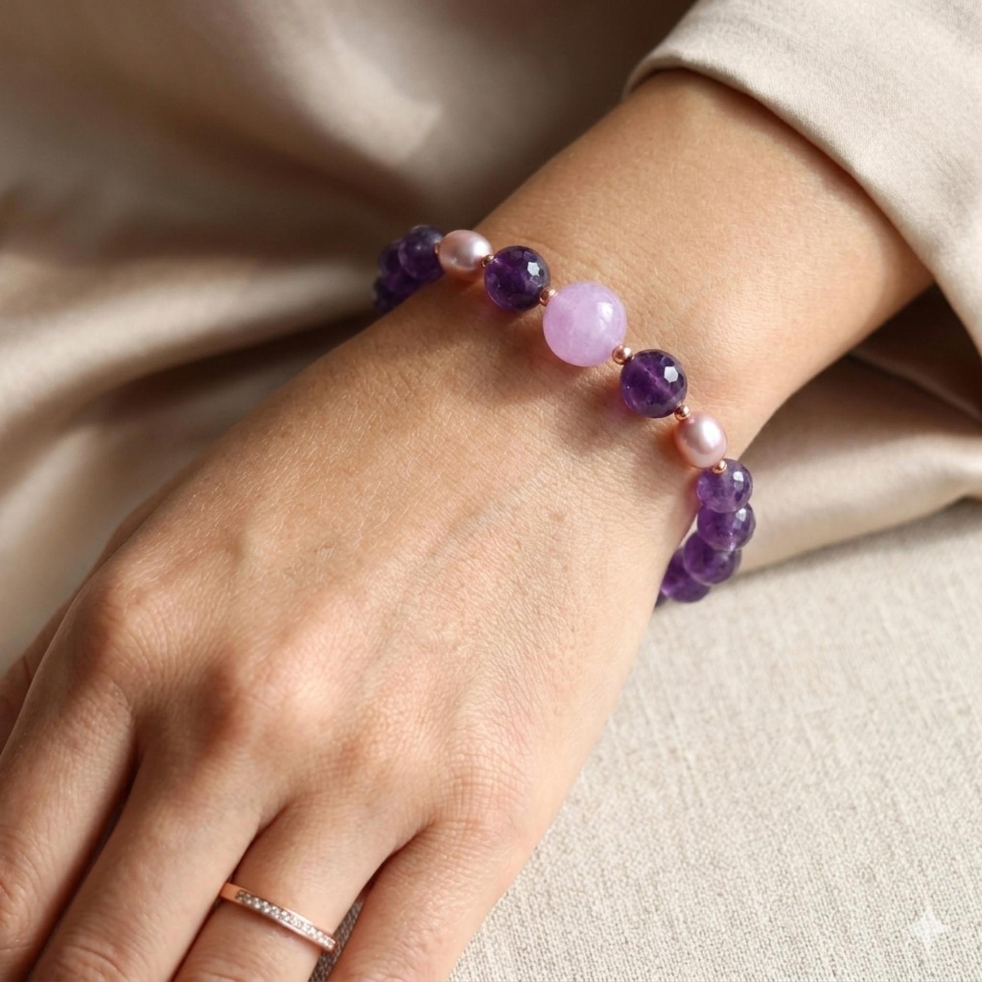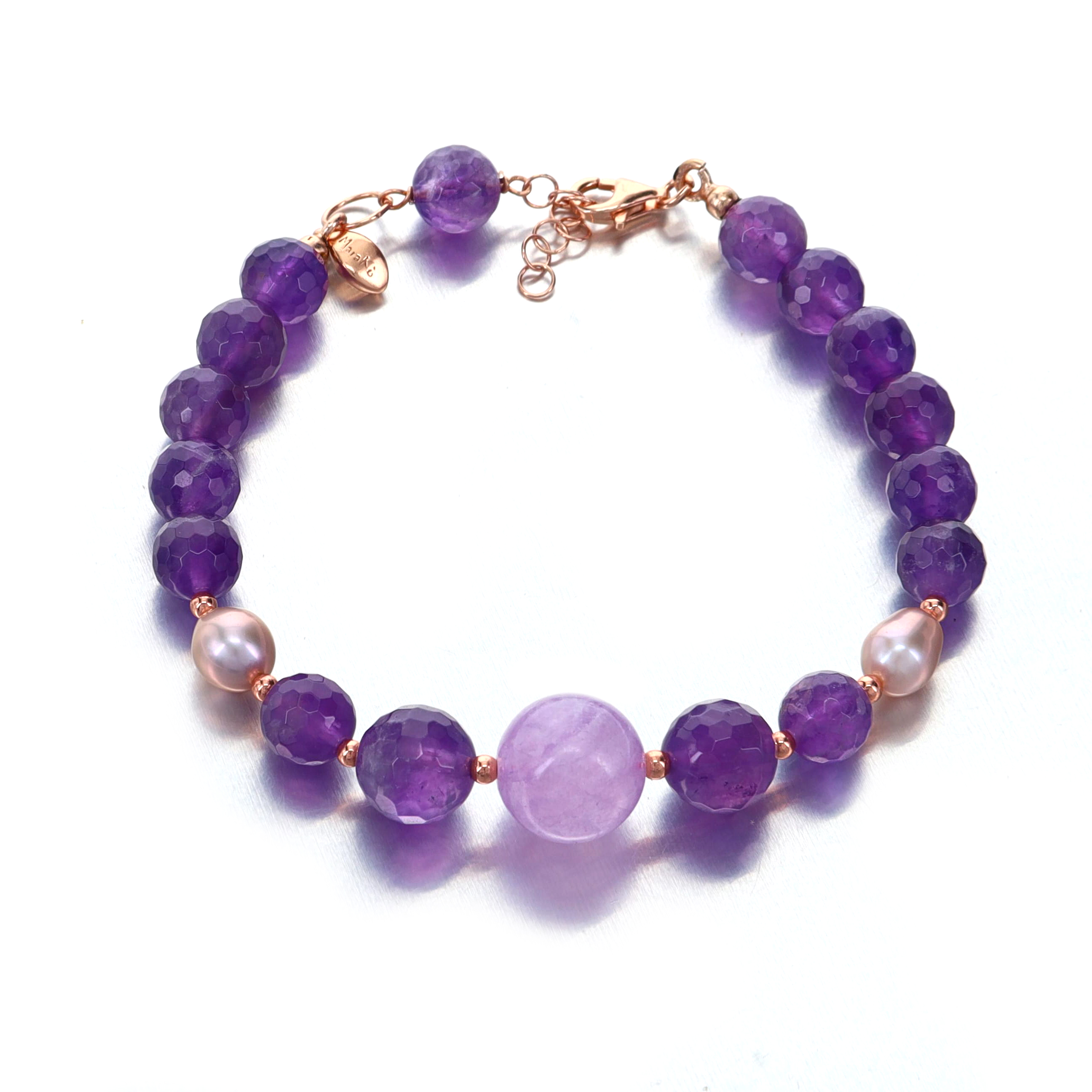 Brățară din ametist fațetat, cu sfere de 6 – 12 mm și perle de cultură, cu sfere de 6 – 7 mm.