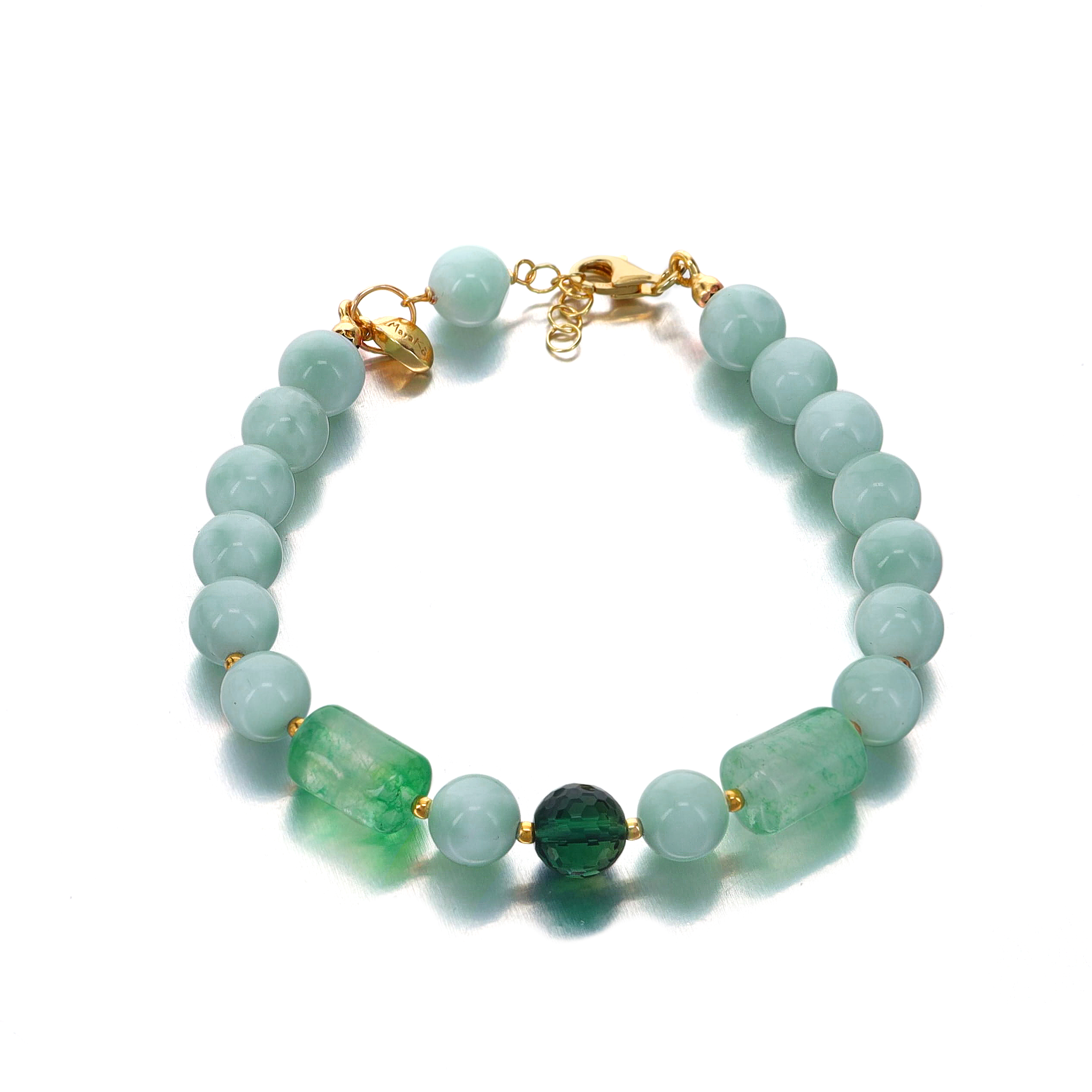 Brățară din diaspor verde, cuarț verde hidrotermal și cuarț verde mușchi, cu sfere de 6 – 12 mm.
