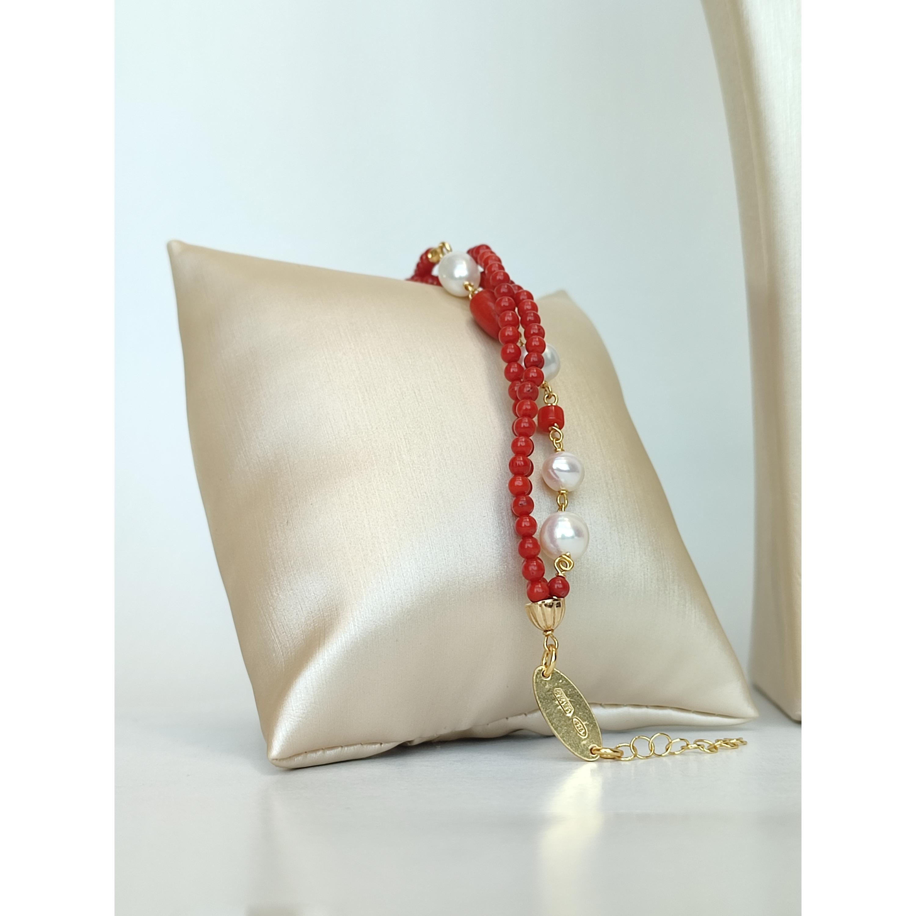Brățară cu trei șiraguri din coral de bambus și perle de cultură.