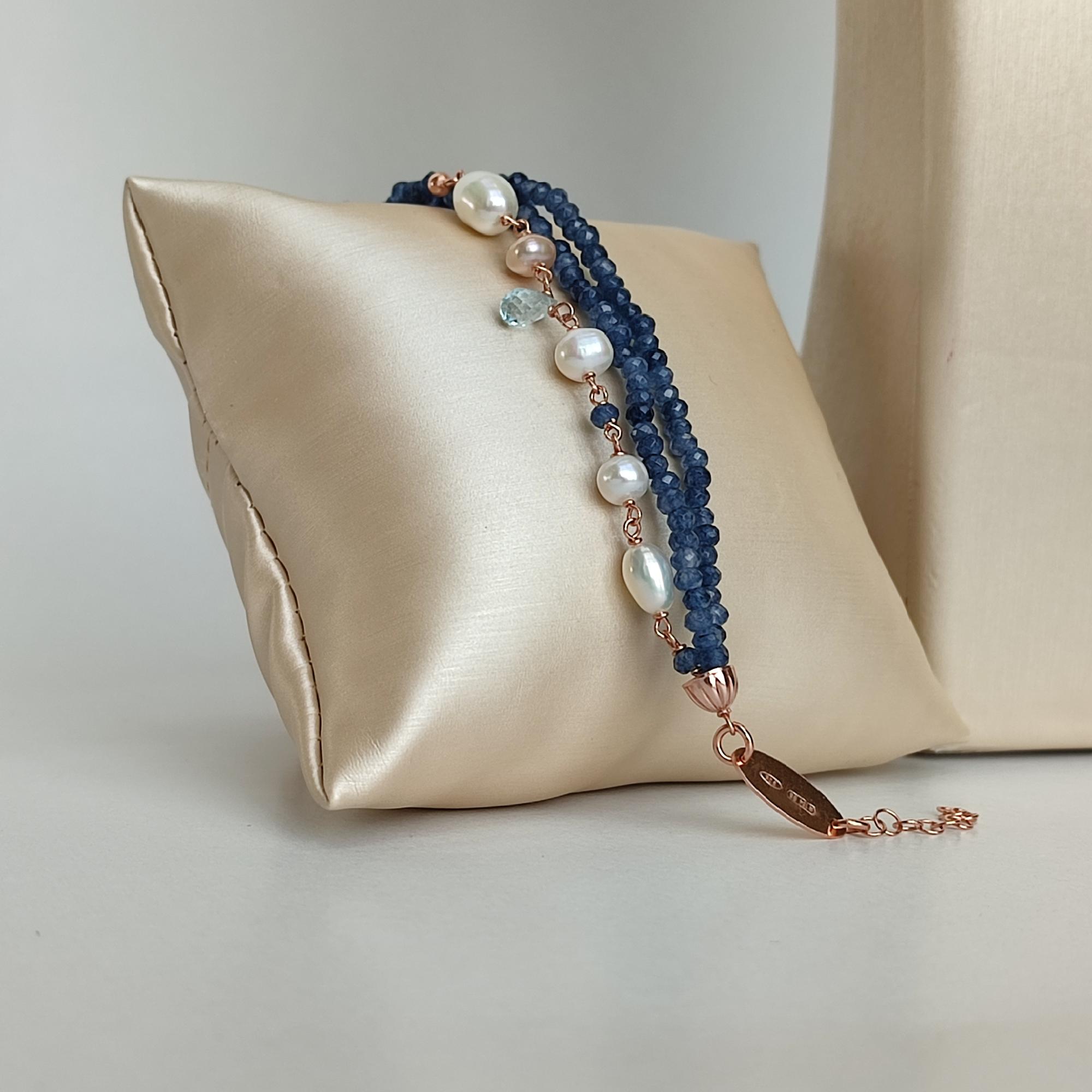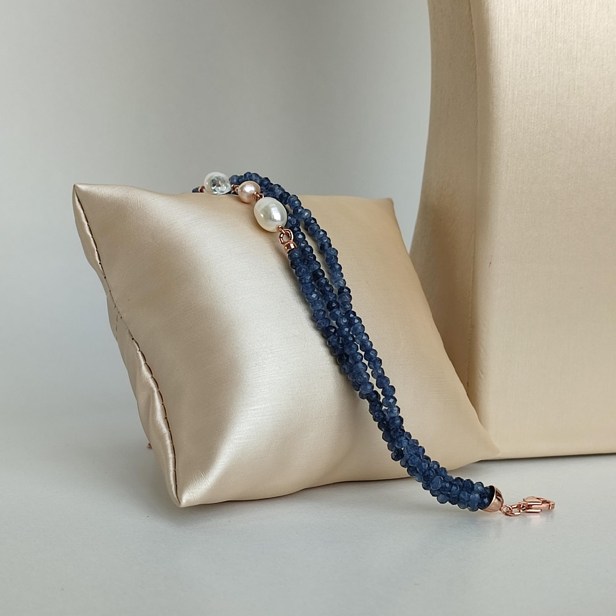 Brățară cu trei șiraguri din agat albastru fațetat, cu sfere de 2 mm, acvamarin și perle de cultură.