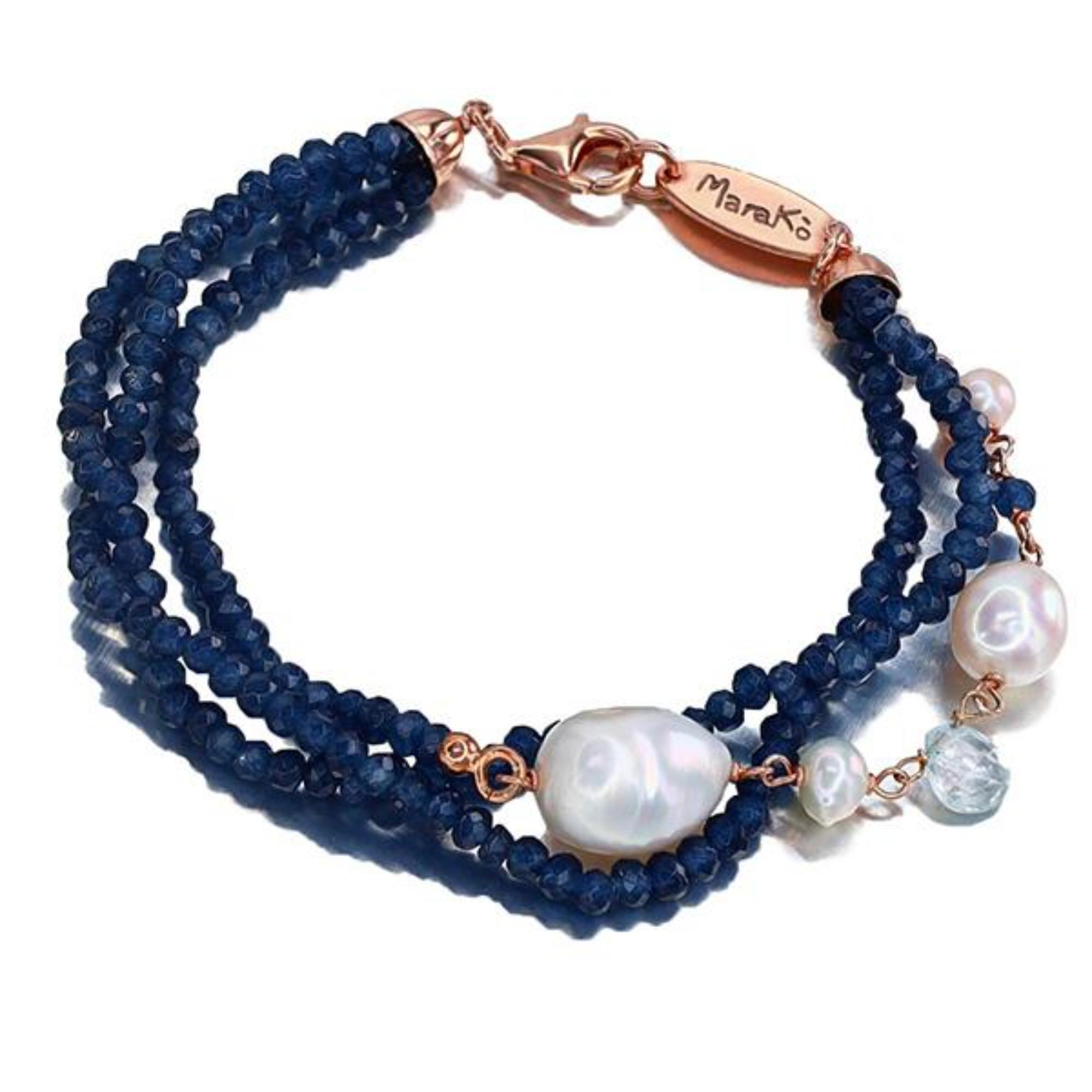Brățară cu trei șiraguri din agat albastru fațetat, cu sfere de 2 mm și perle de cultură.