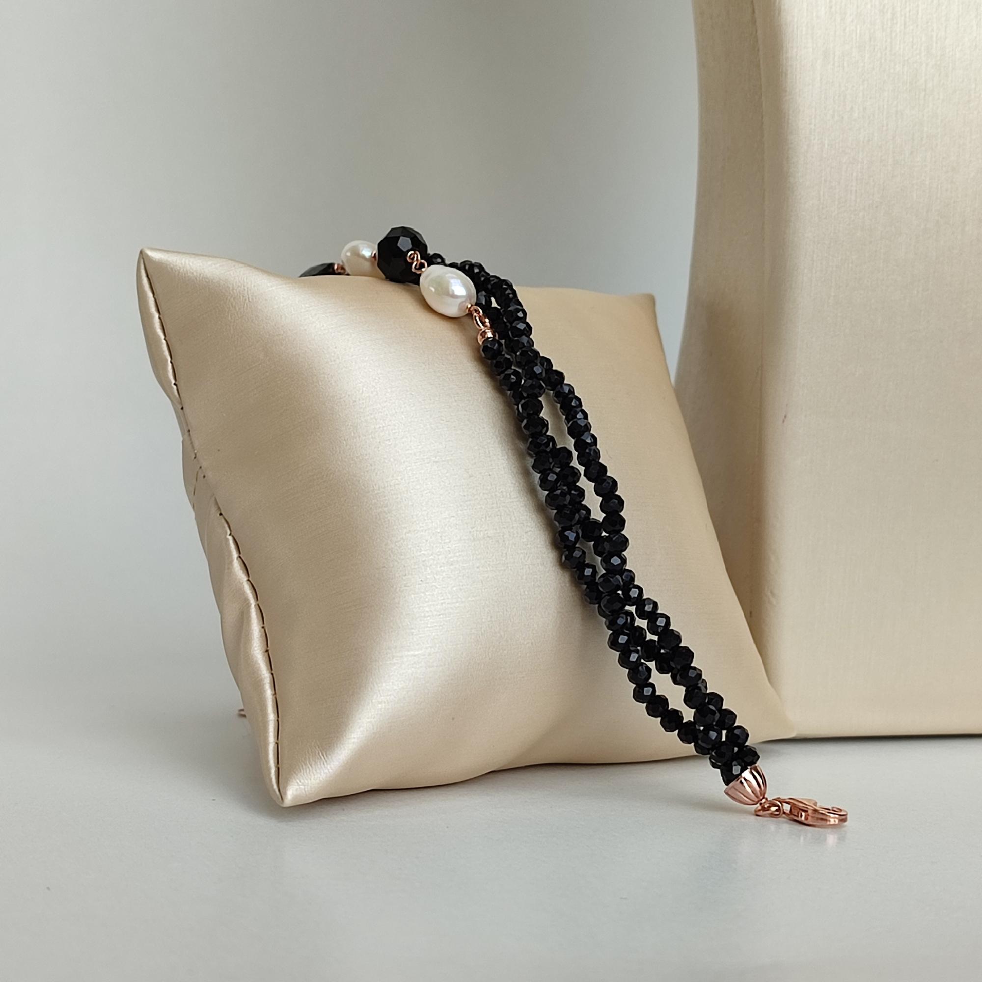 Brățară cu trei șiraguri din agat negru fațetat, cu sfere de 2 mm, spinel negru și perle de cultură.