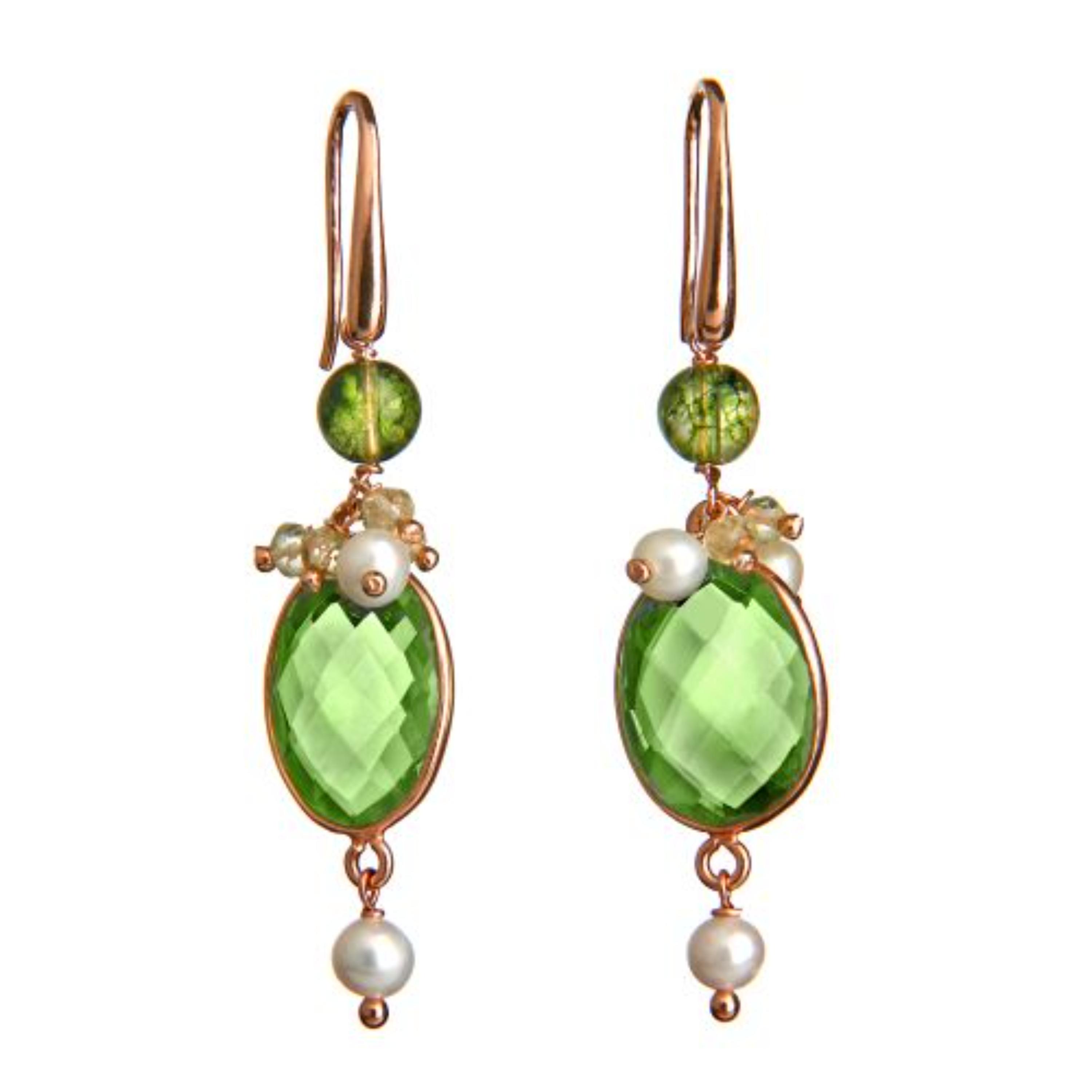 Cercei din cuarț verde, ametist verde și perle perle de cultură, cu montură de 18 per 13 mm.