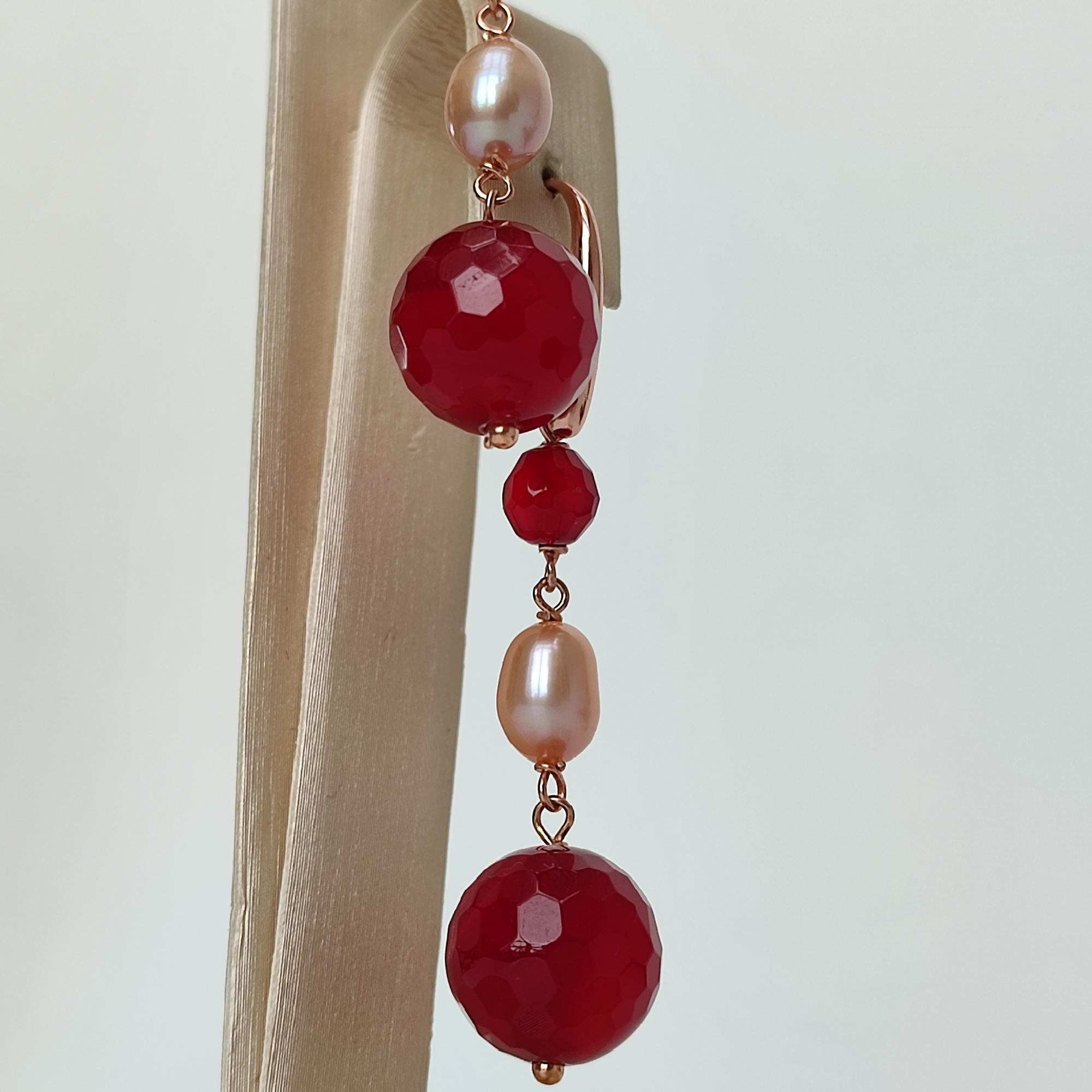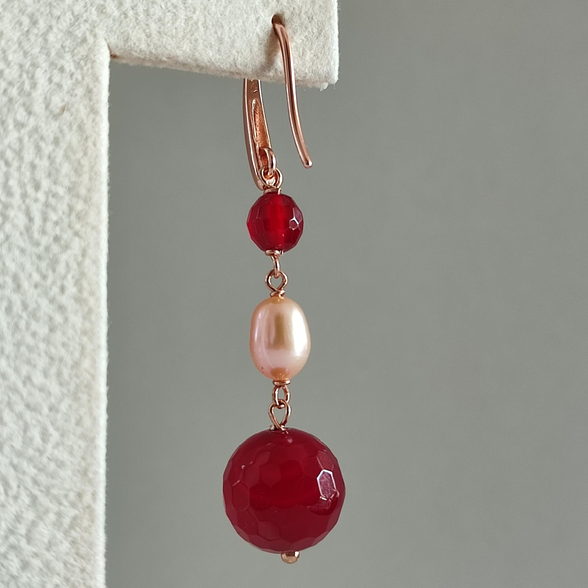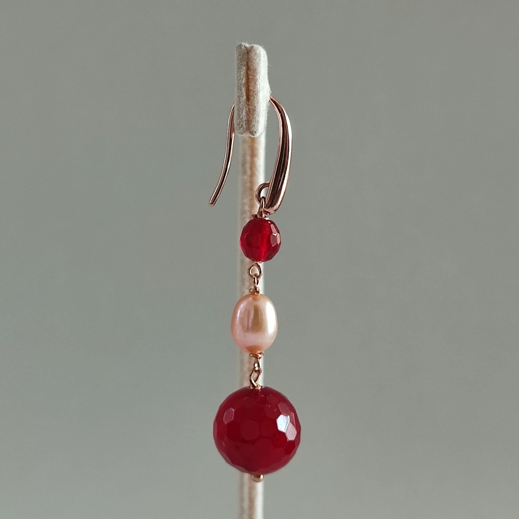Cercei din agat rubiniu fațetat cu sfere de 5 și 10 mm și perle de cultură cu sfere de 7 mm.