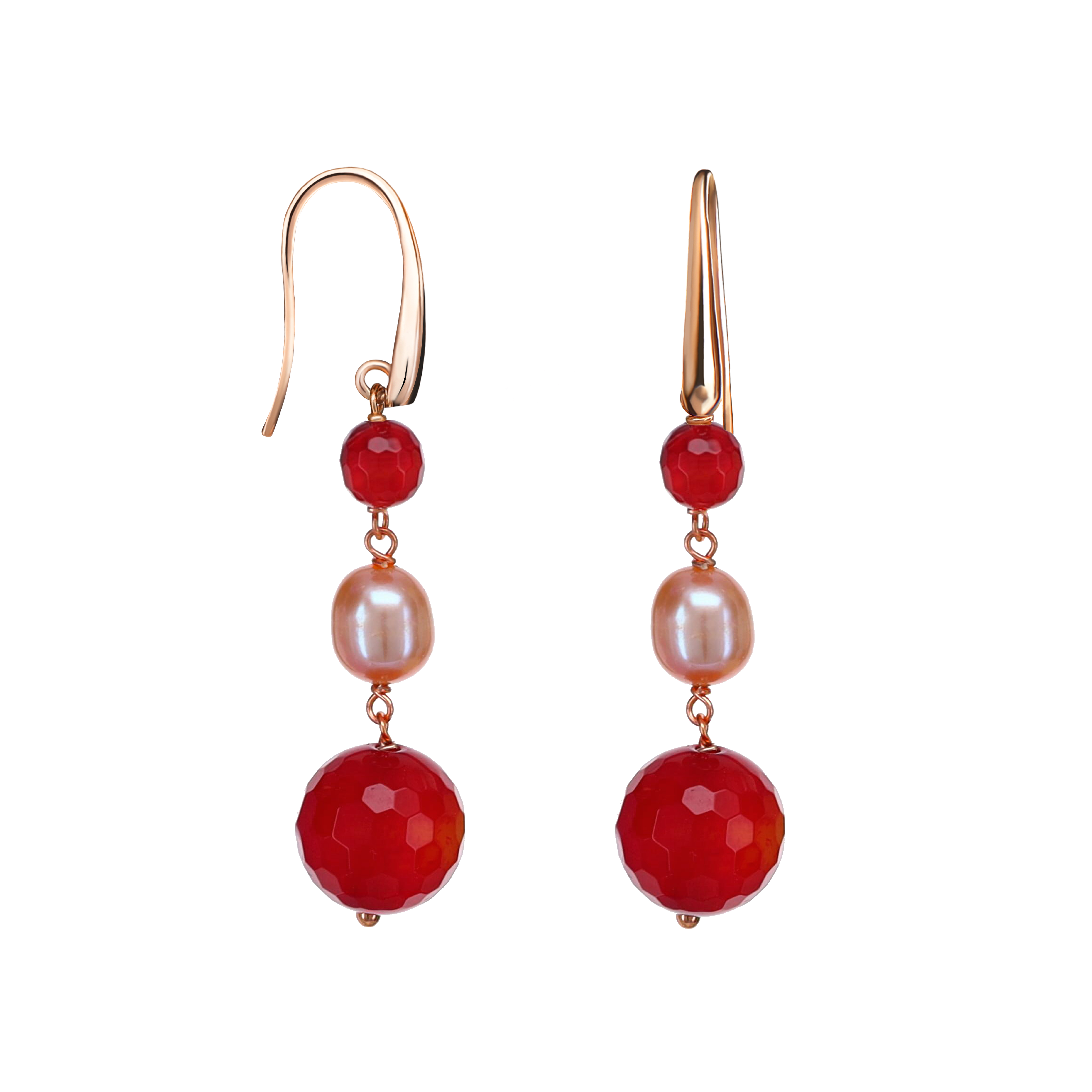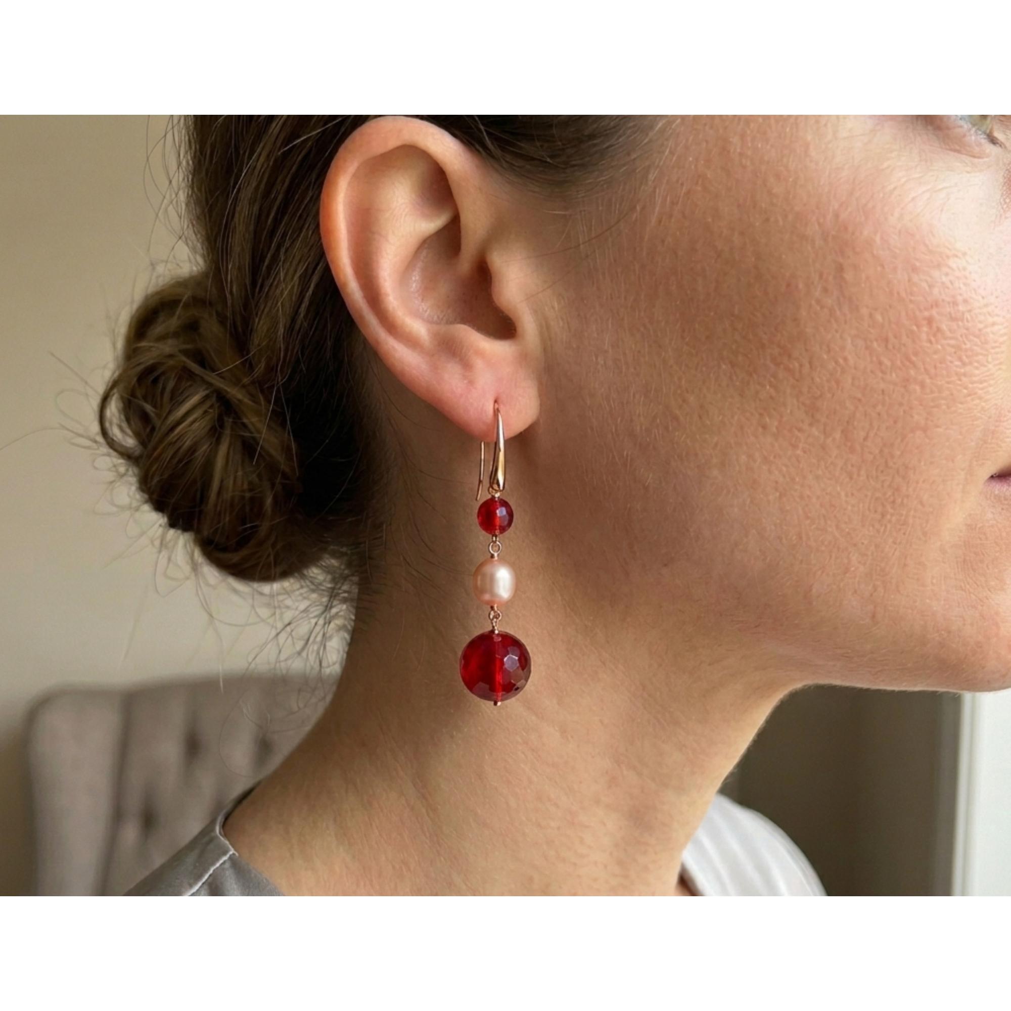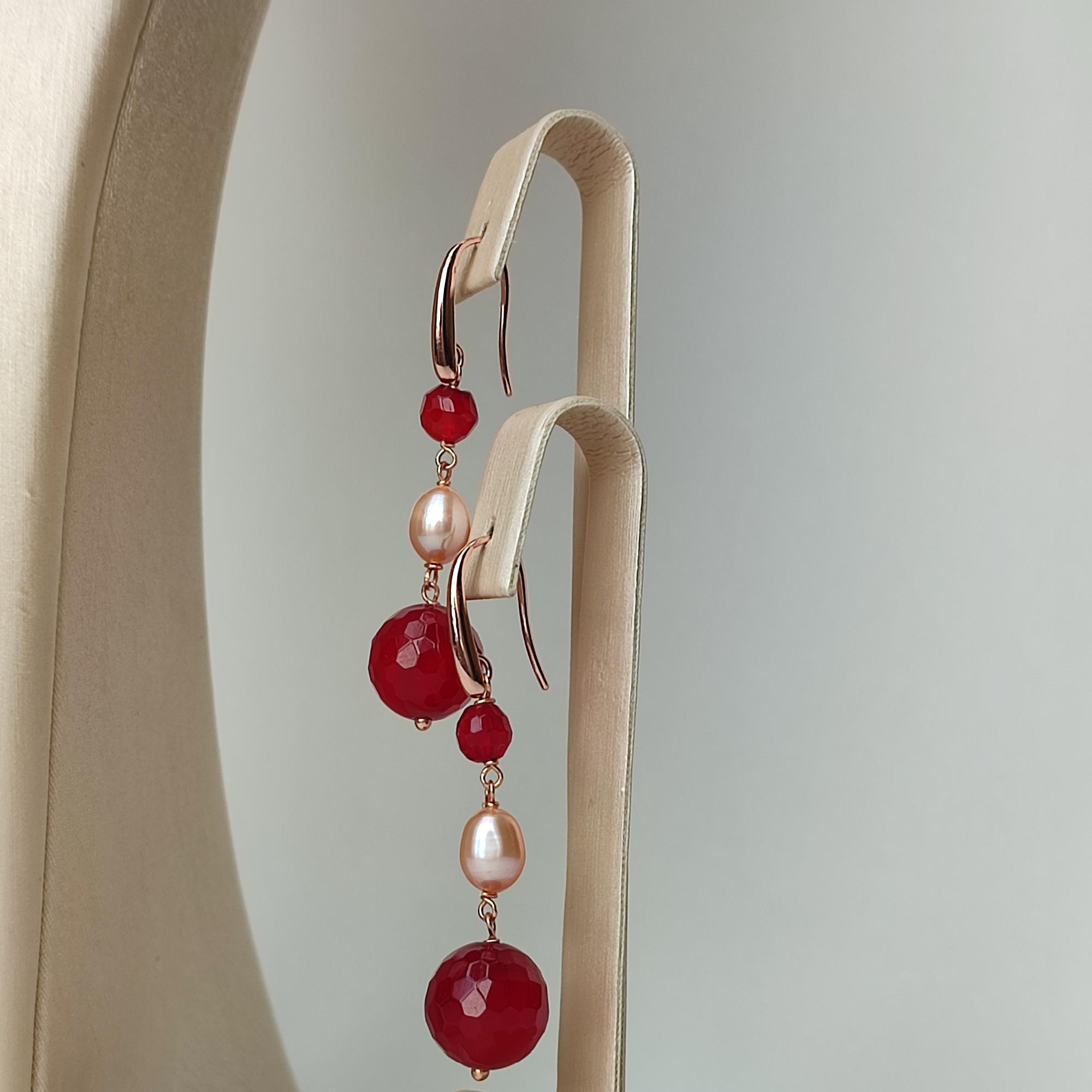 Cercei din agat rubiniu fațetat cu sfere de 5 și 10 mm și perle de cultură cu sfere de 7 mm.
