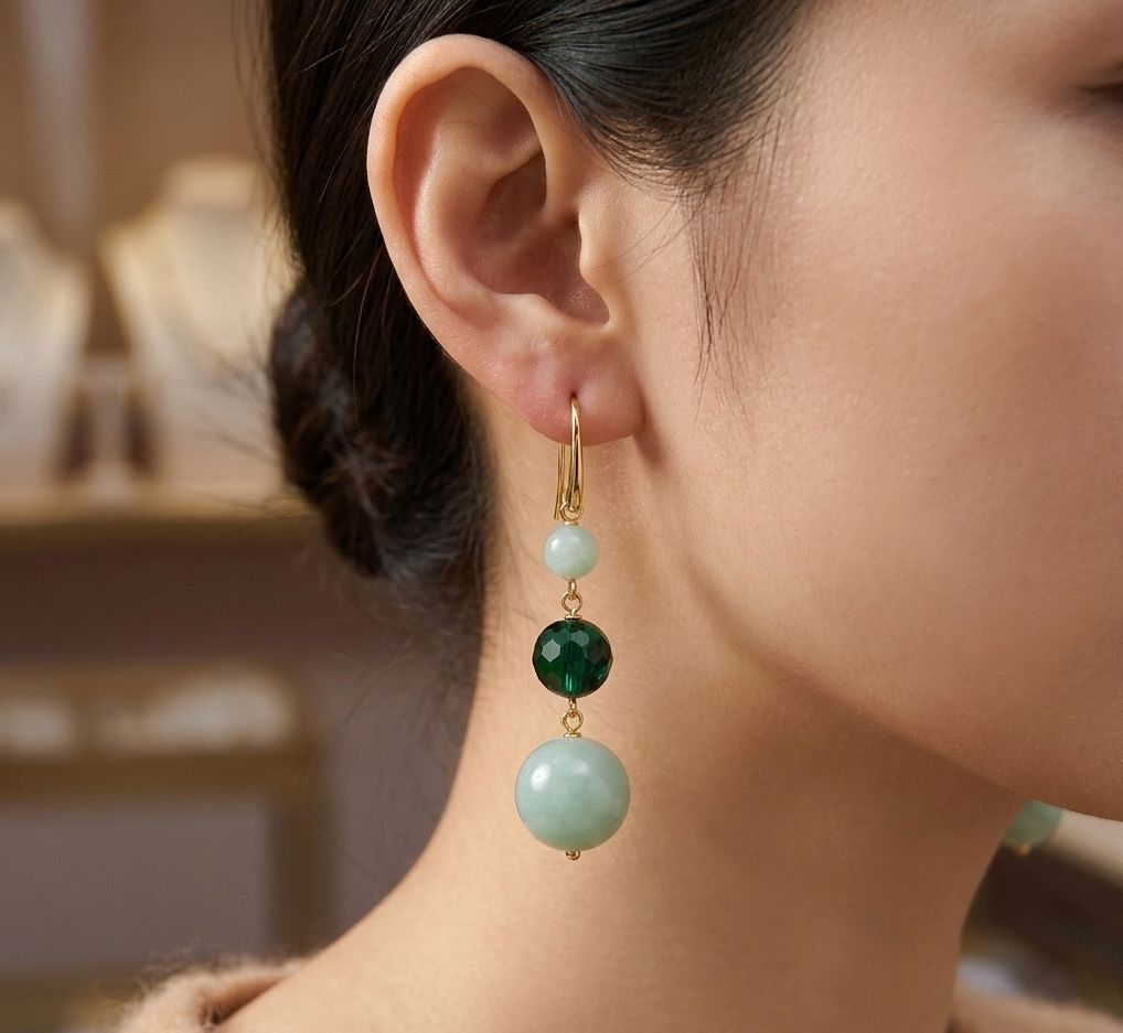 Cercei din diaspor verde cu sfere de 5 și 10 mm și cuarț verde hidrotermal cu sfere de 7 mm.