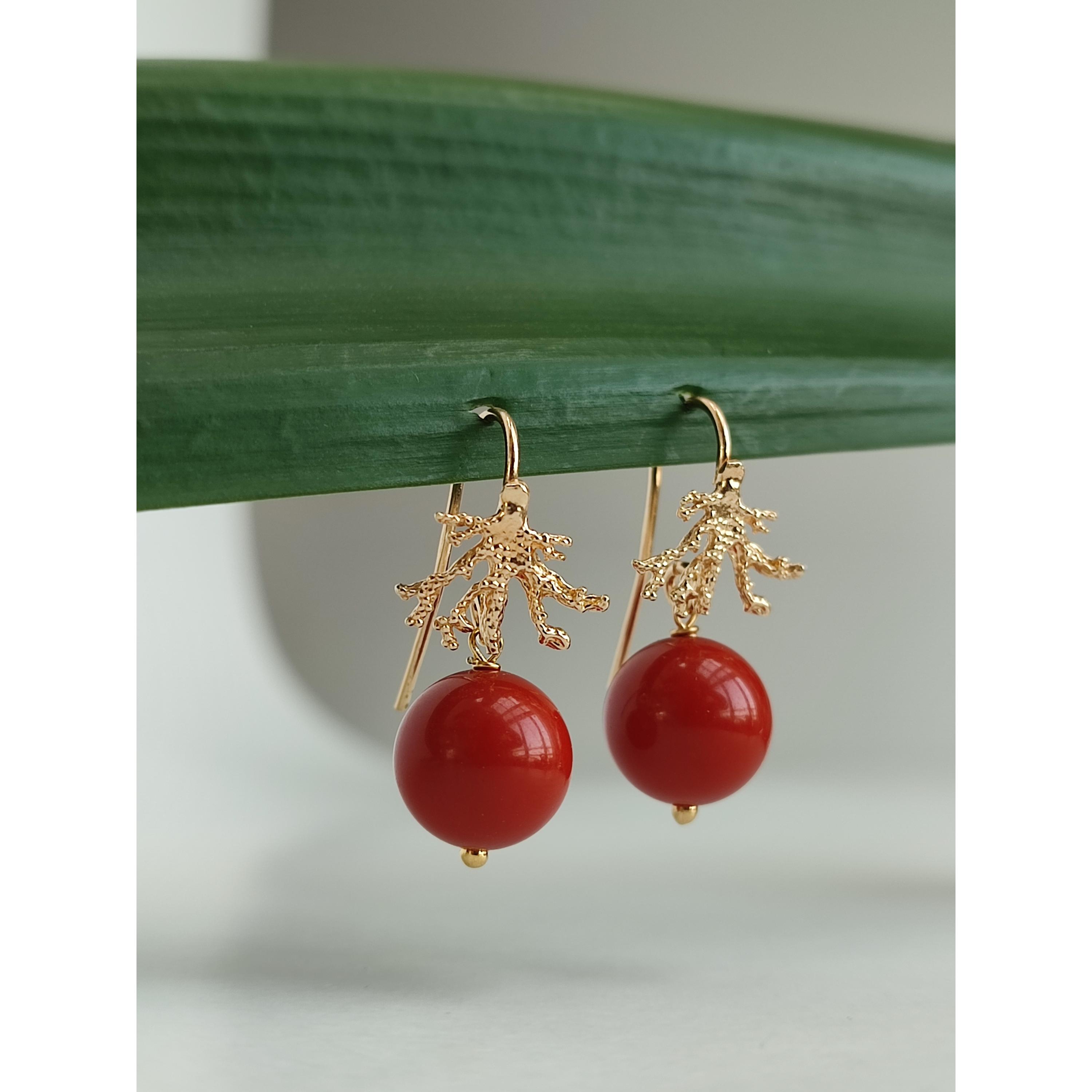 Cercei din coral de bambus roșu, cu sfere de 12 mm.