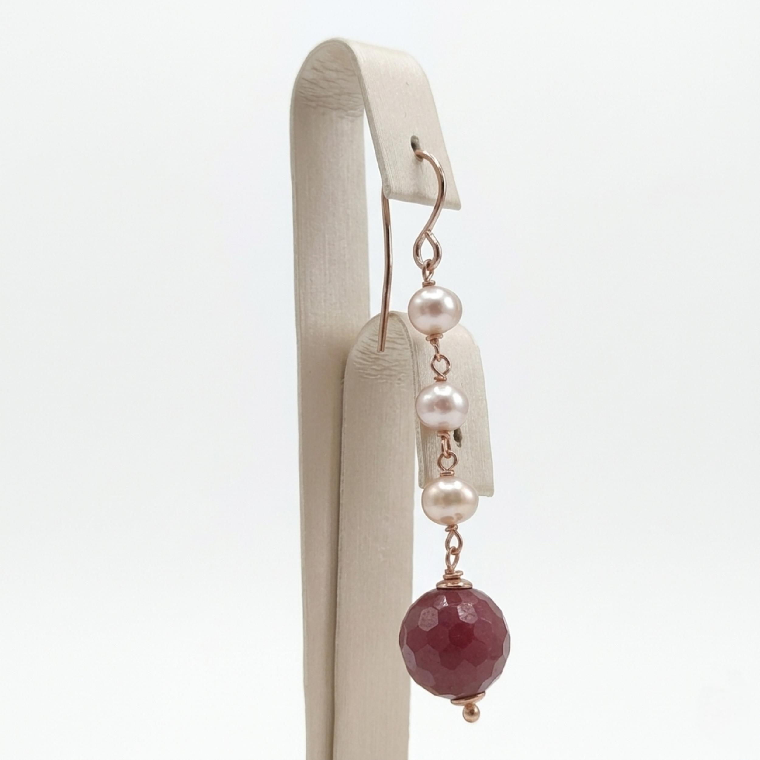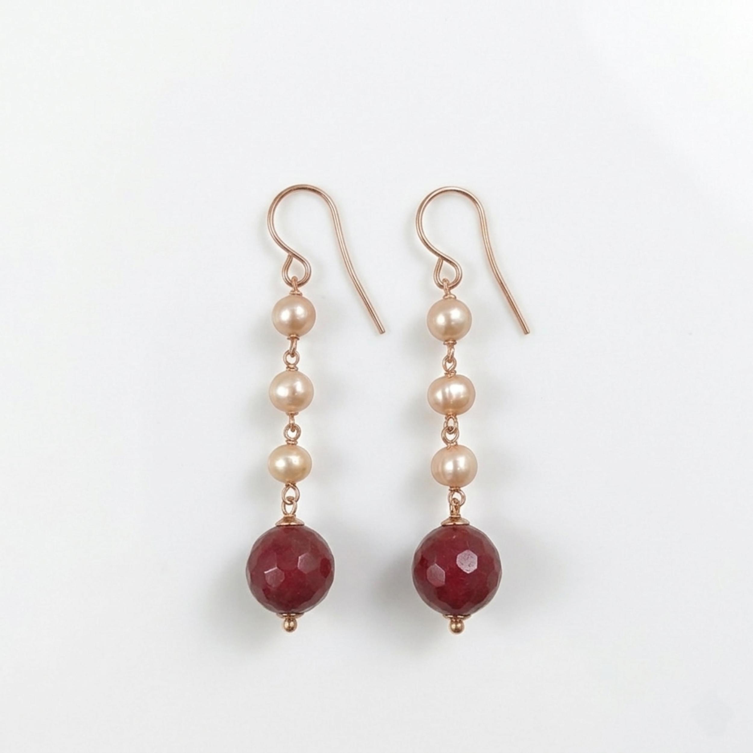 Cercei din agat rubiniu fațetat și perle de cultură roz.