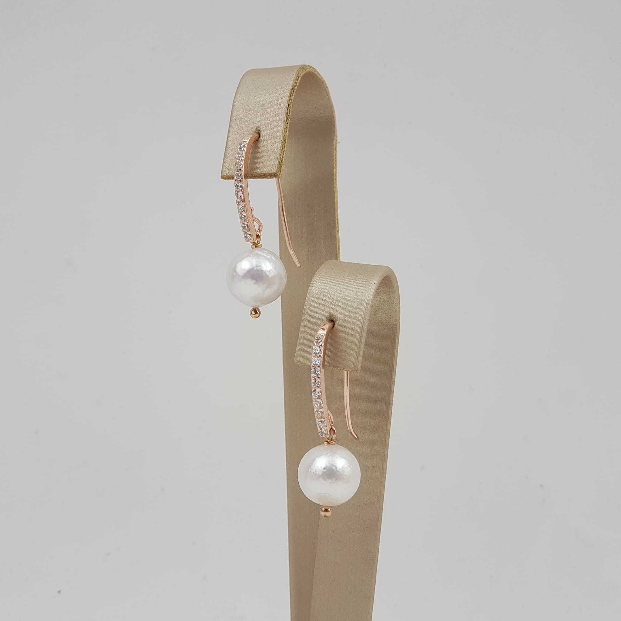 Cercei din perle de cultură albe, cu sfere de 10 mm și zirconiu.