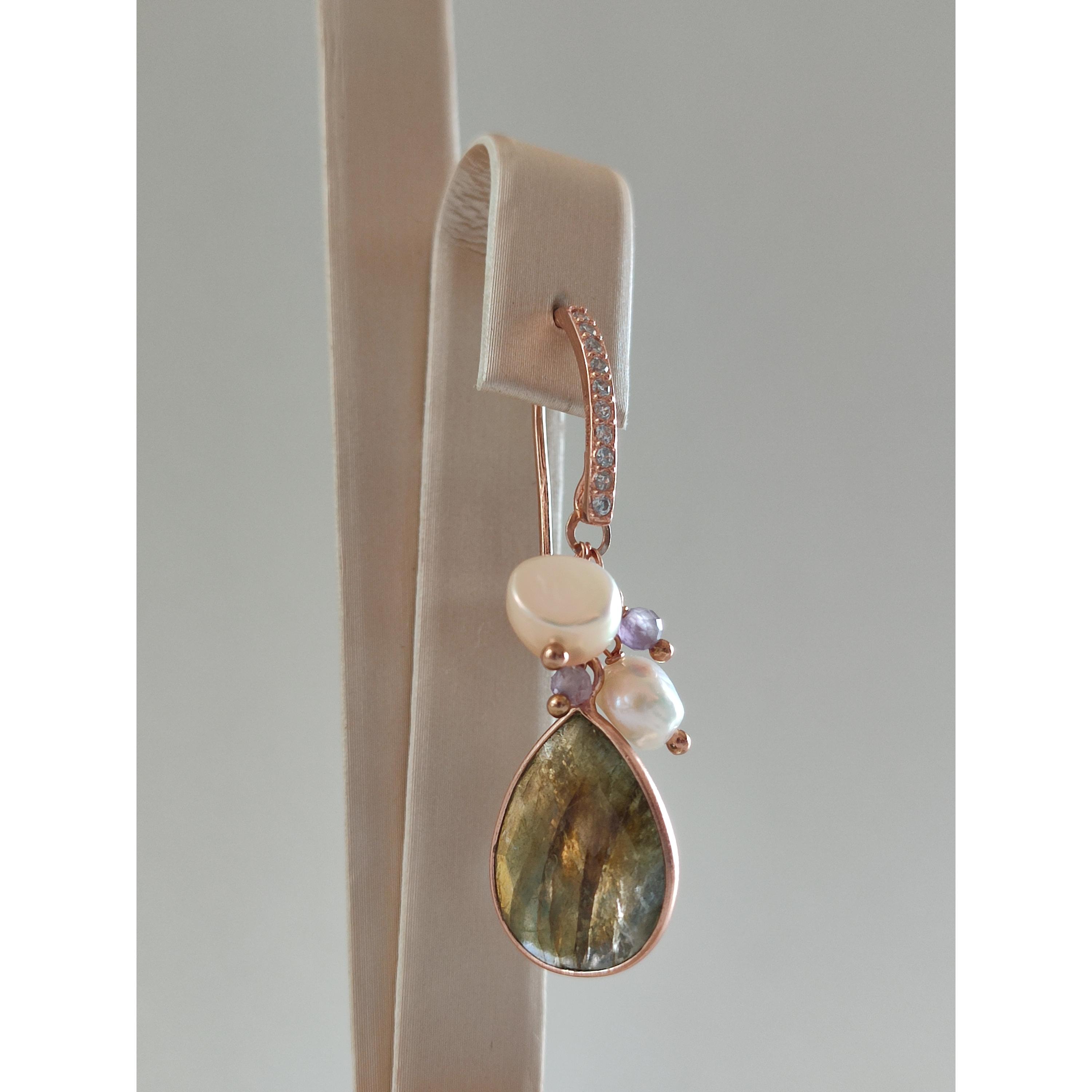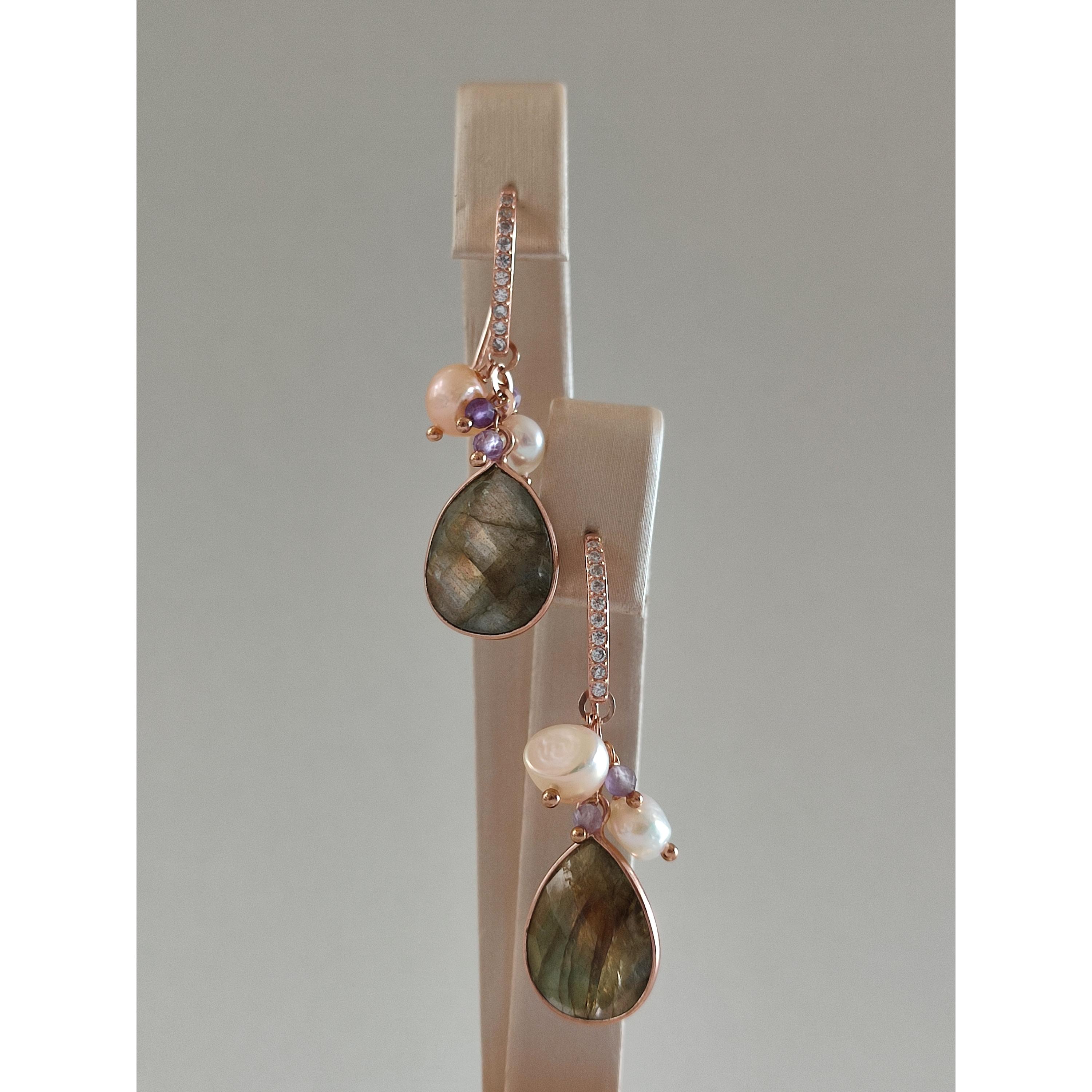 Cercei din labradorit, ametist, zirconiu și perle de cultură.