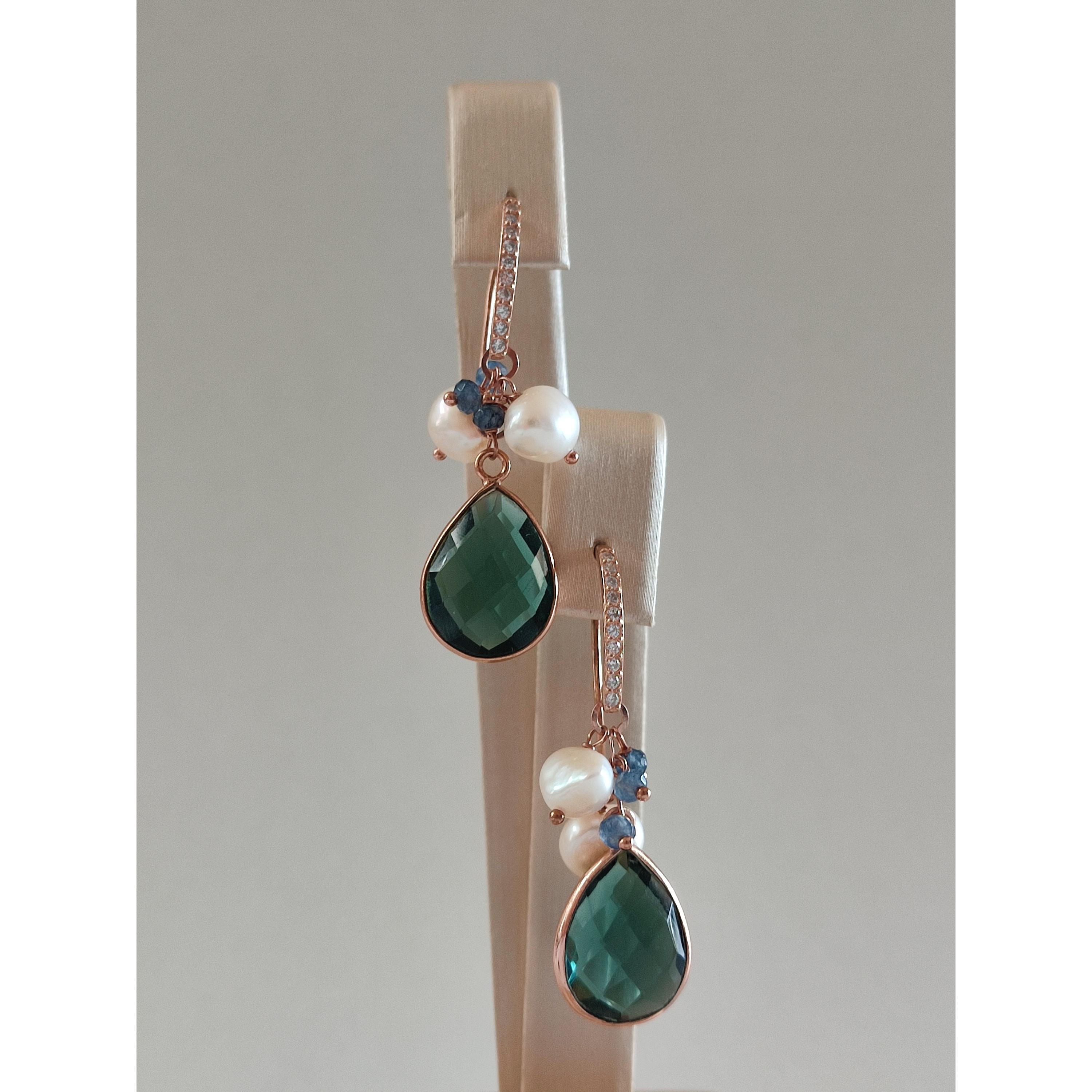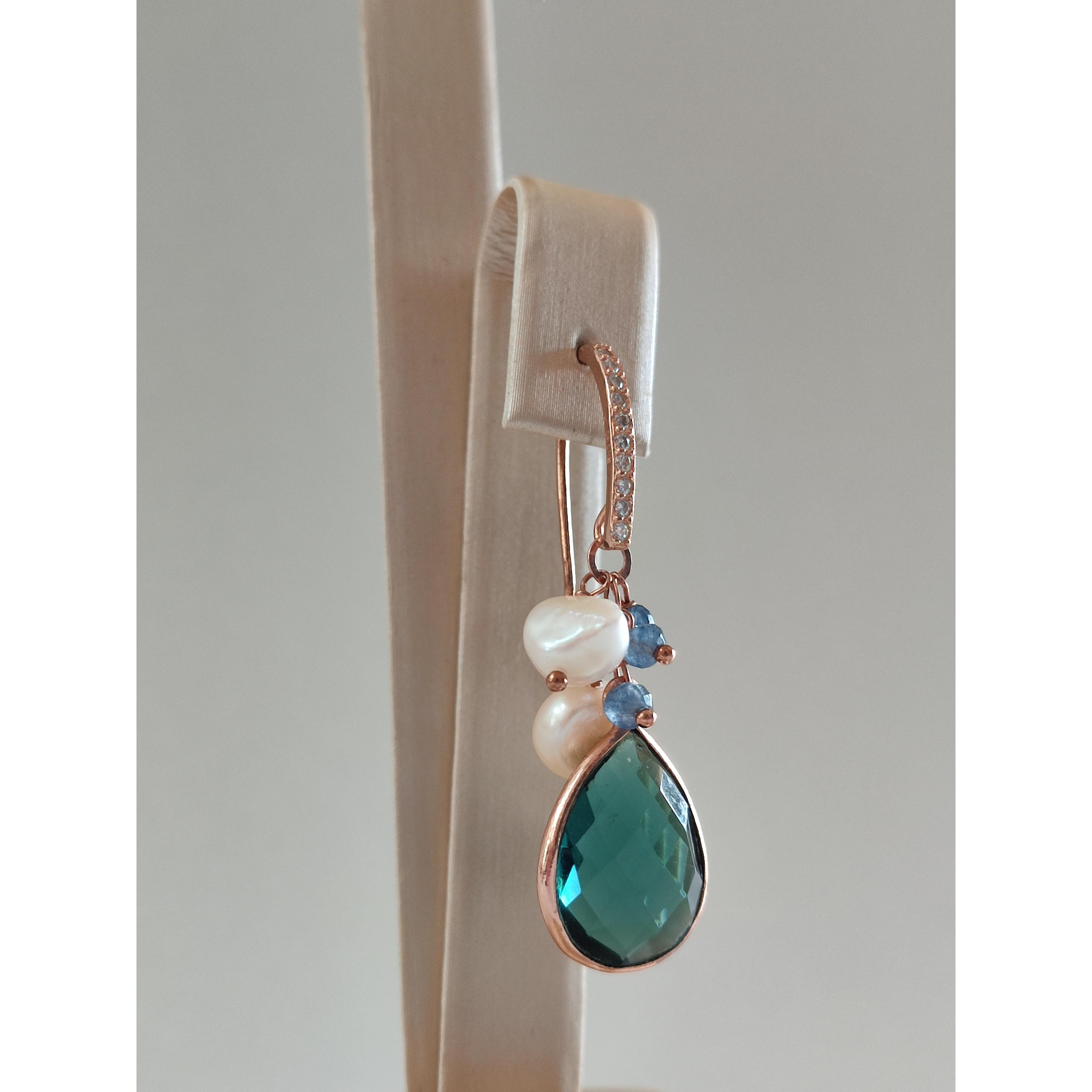 Cercei din cuarț hidrotermal albastru, zirconiu și perle de cultură.