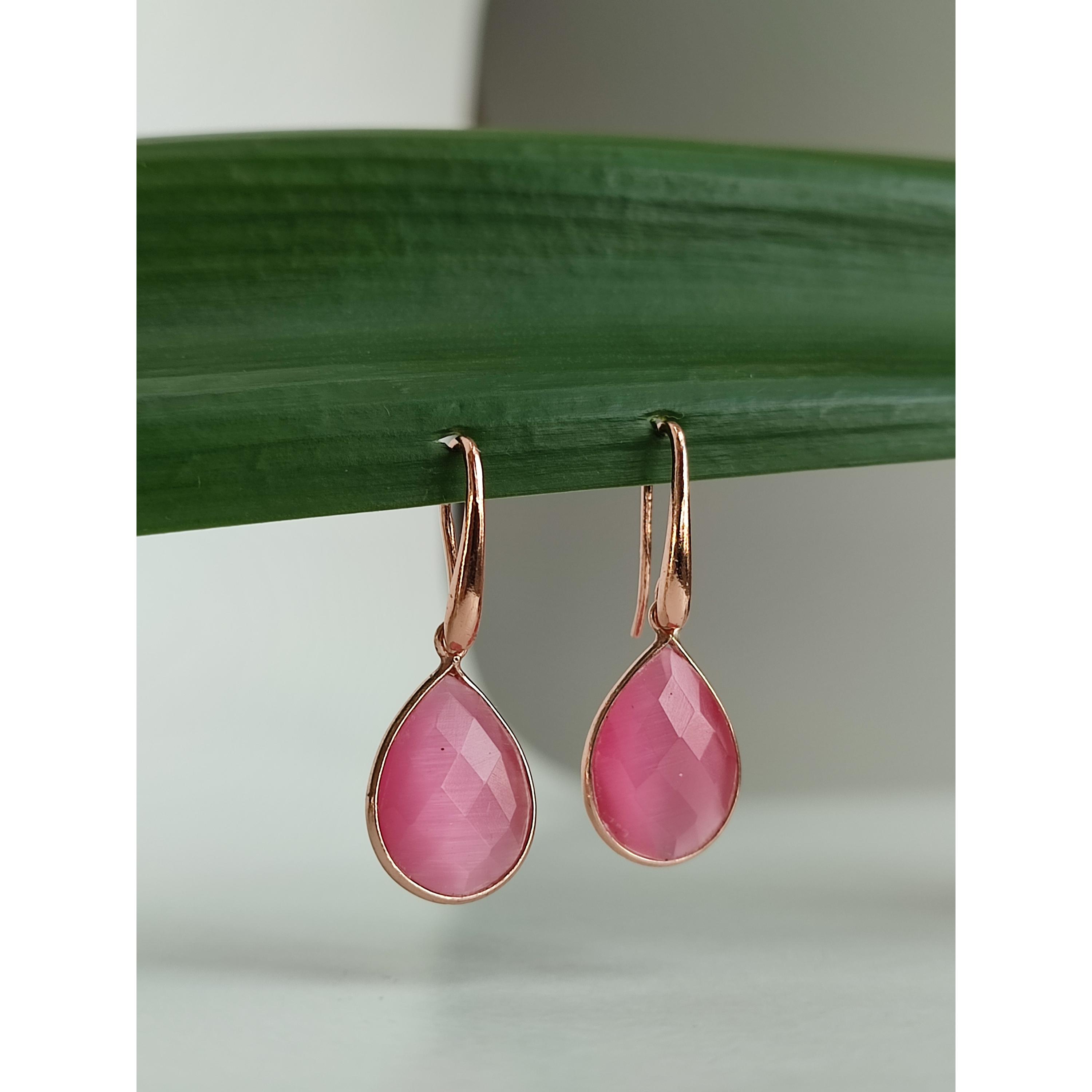 Cercei din agat roz fațetat, în formă de lacrimă, cu montură de 18 per 13 mm.
