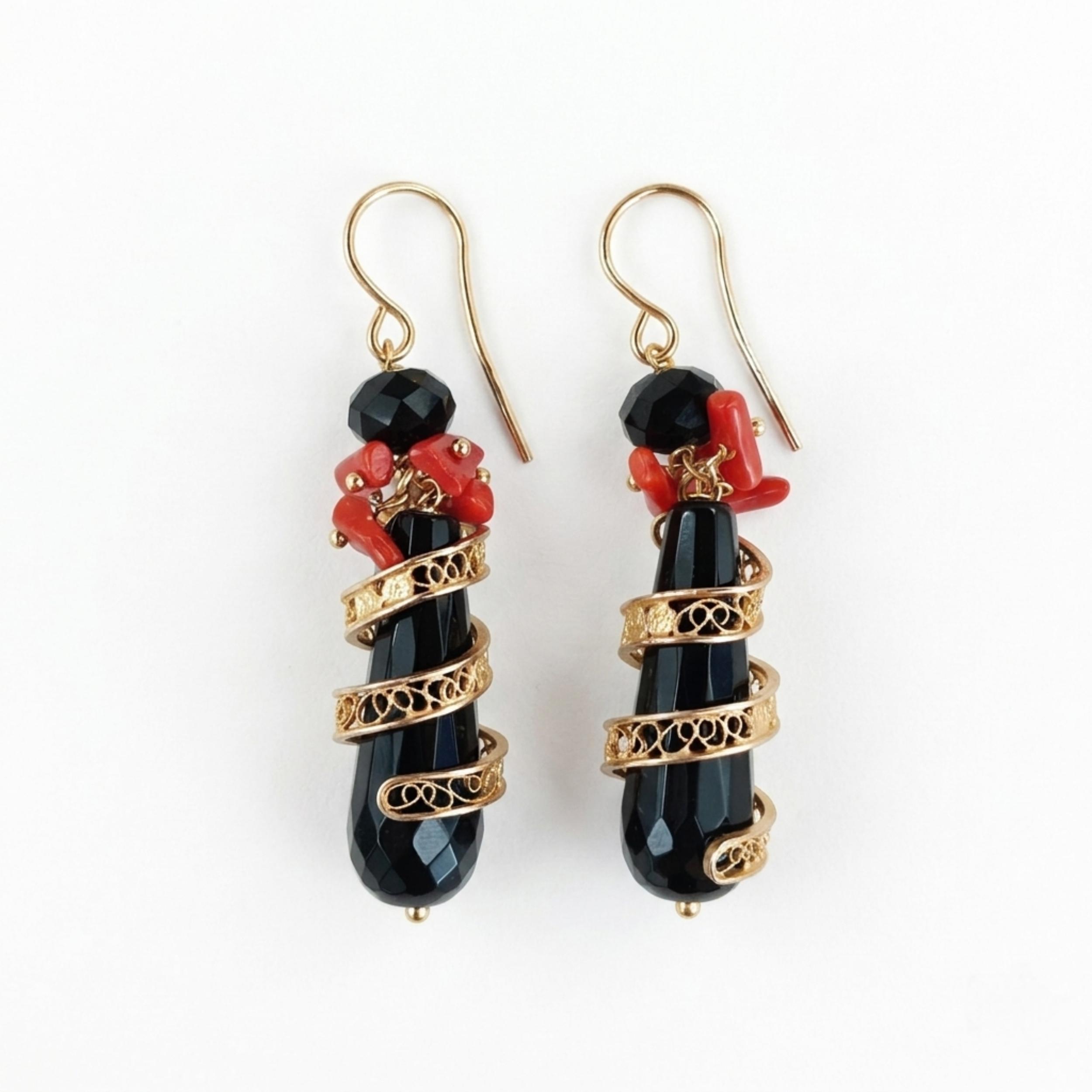 Cercei Sharon din agat negru, coral roșu natural și spirale filigran.