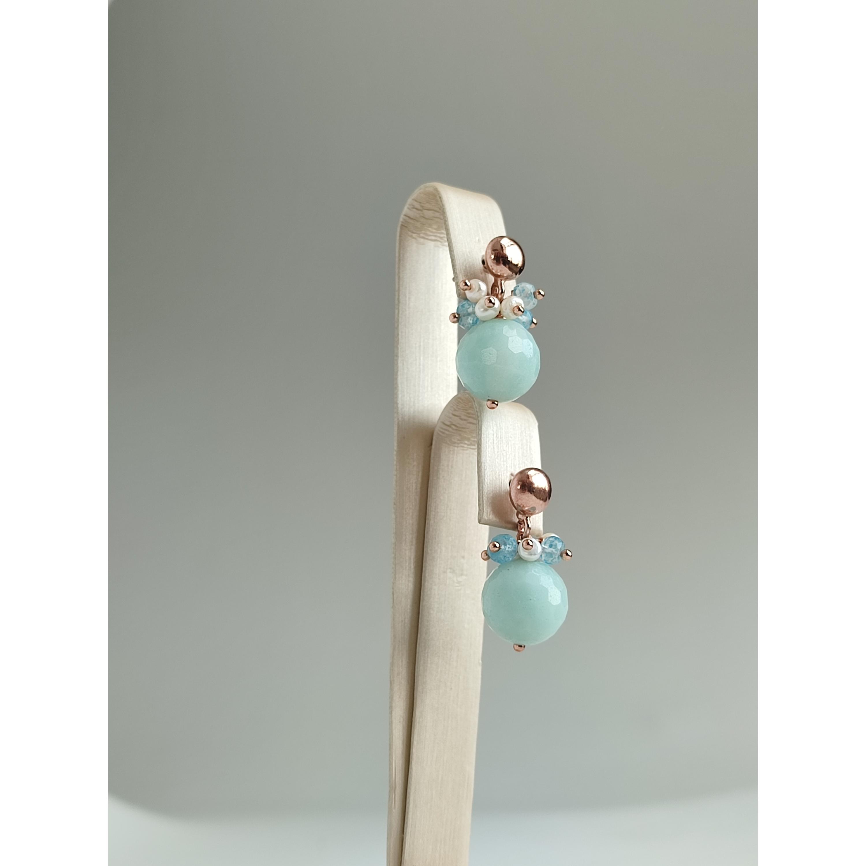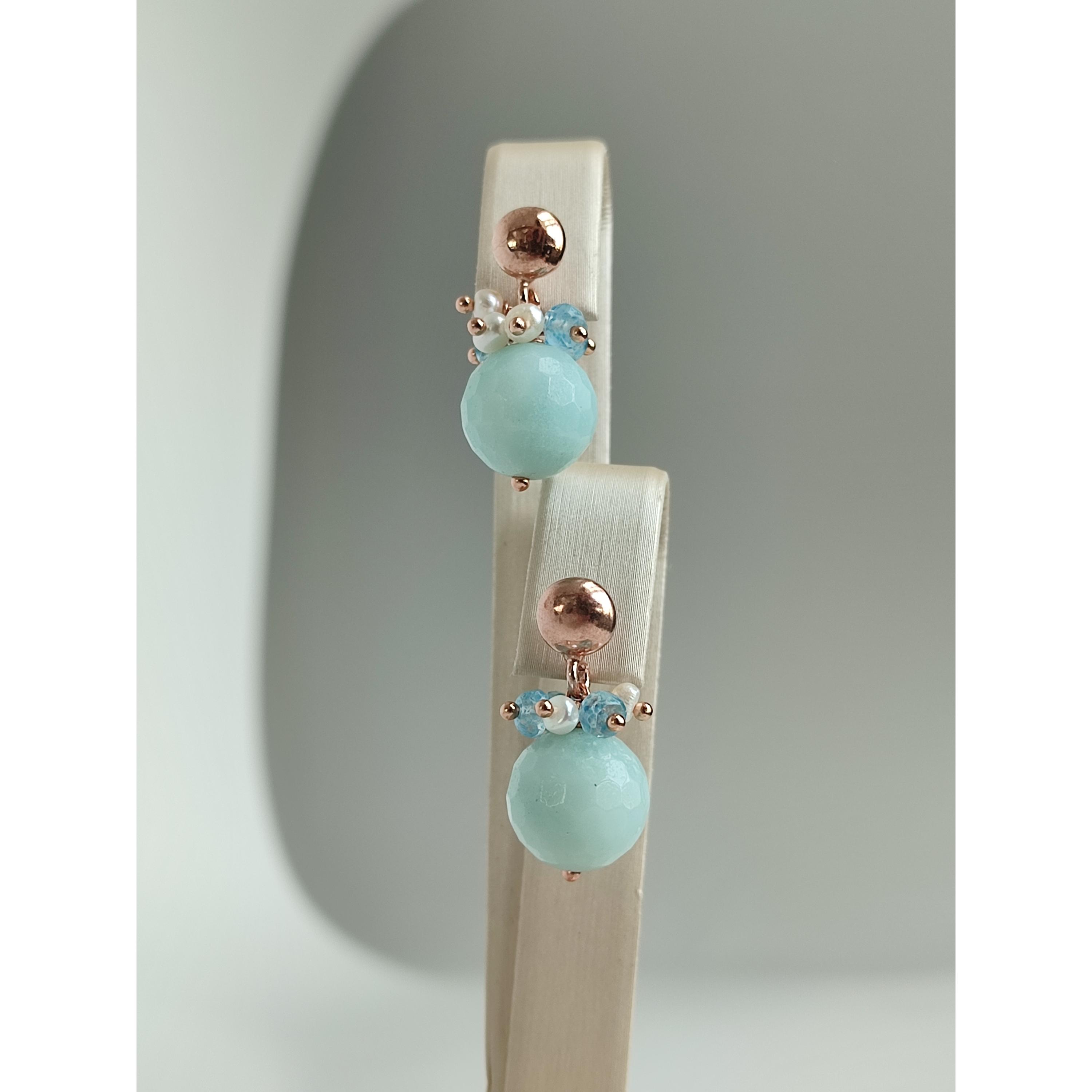 Cercei din amazonit, cu sfere de 12 mm și perle de cultură.