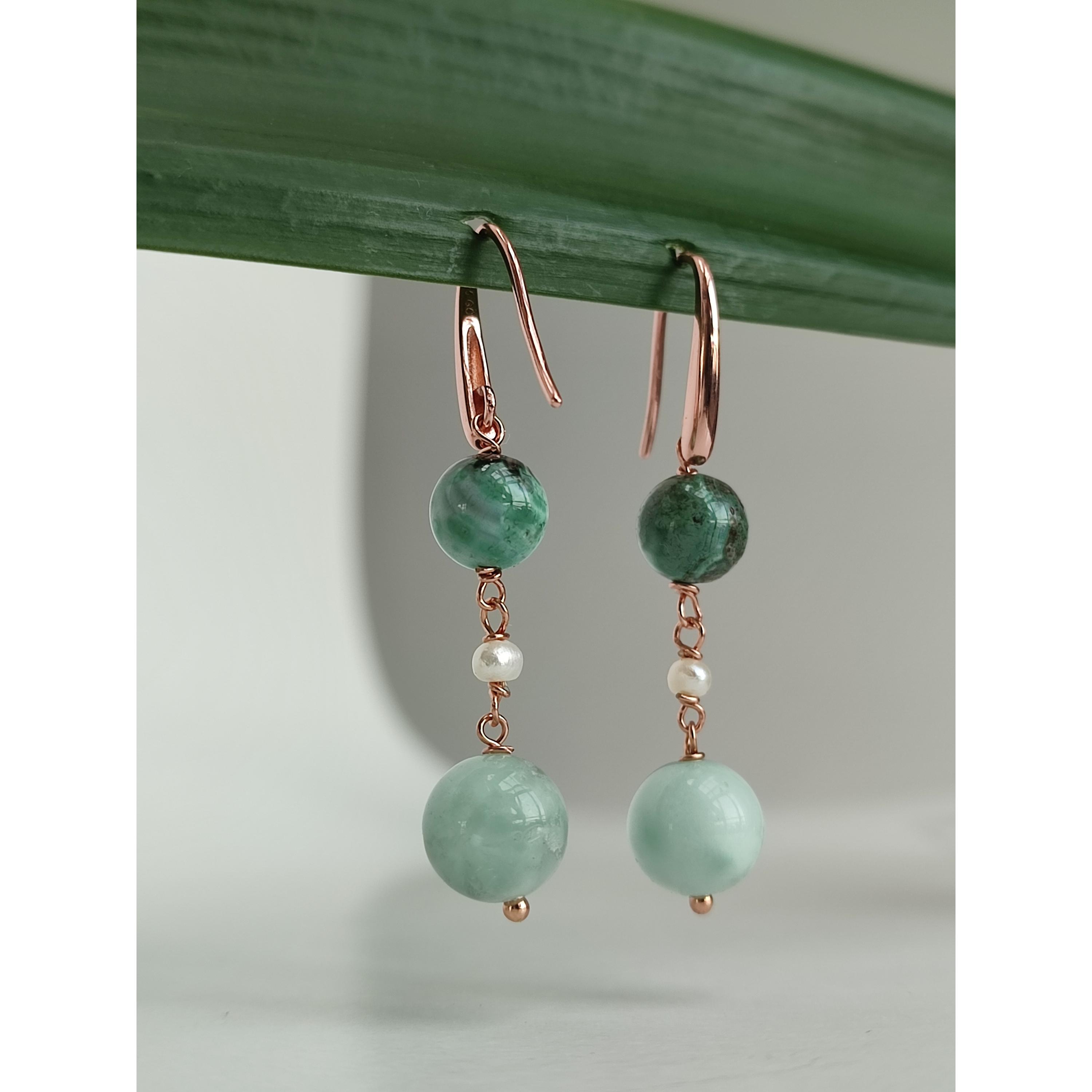 Cercei din diaspor verde, cu sfere de 10 mm, ocean jad, cu sfere de 8 mm si perle de cultură, cu sfere de 3 mm.