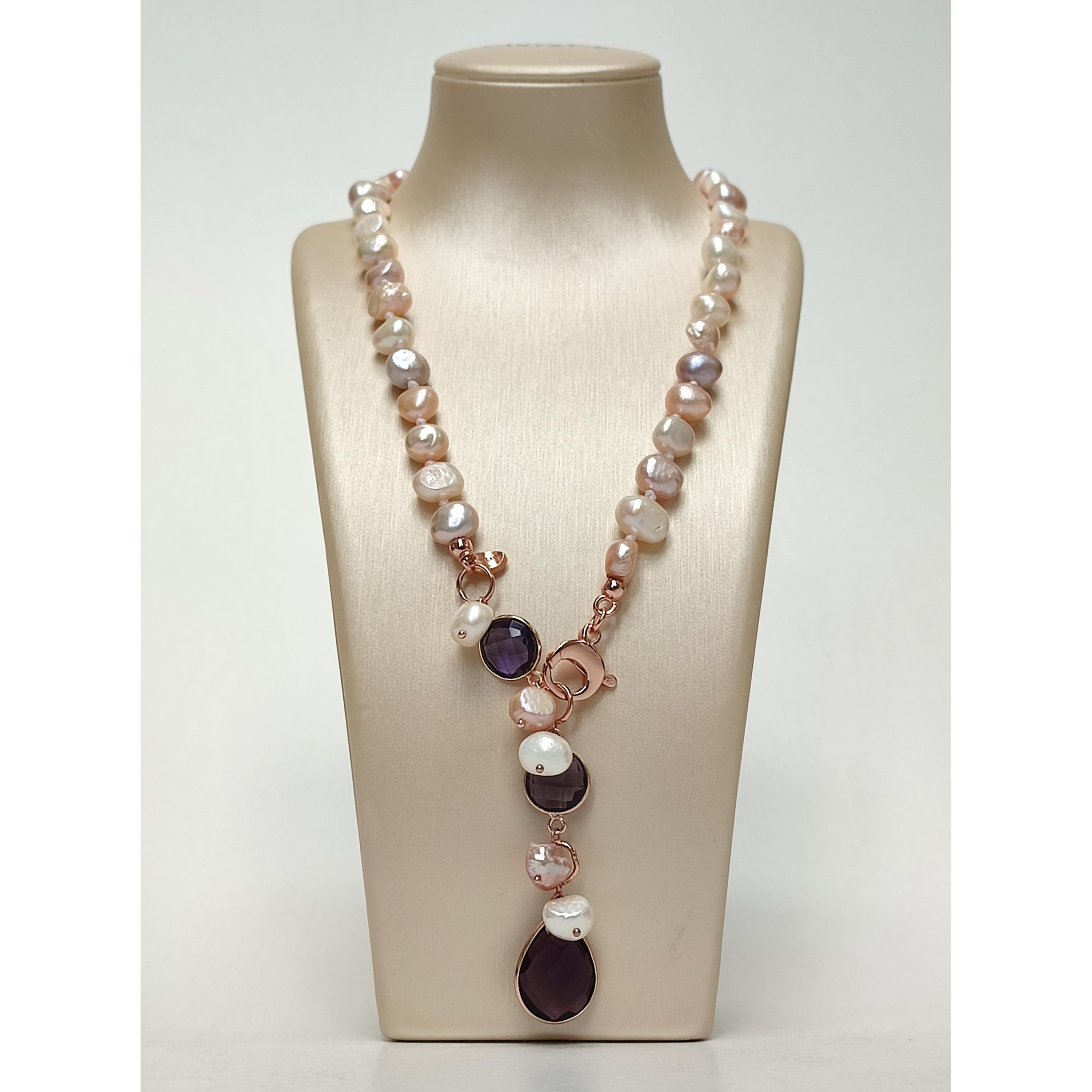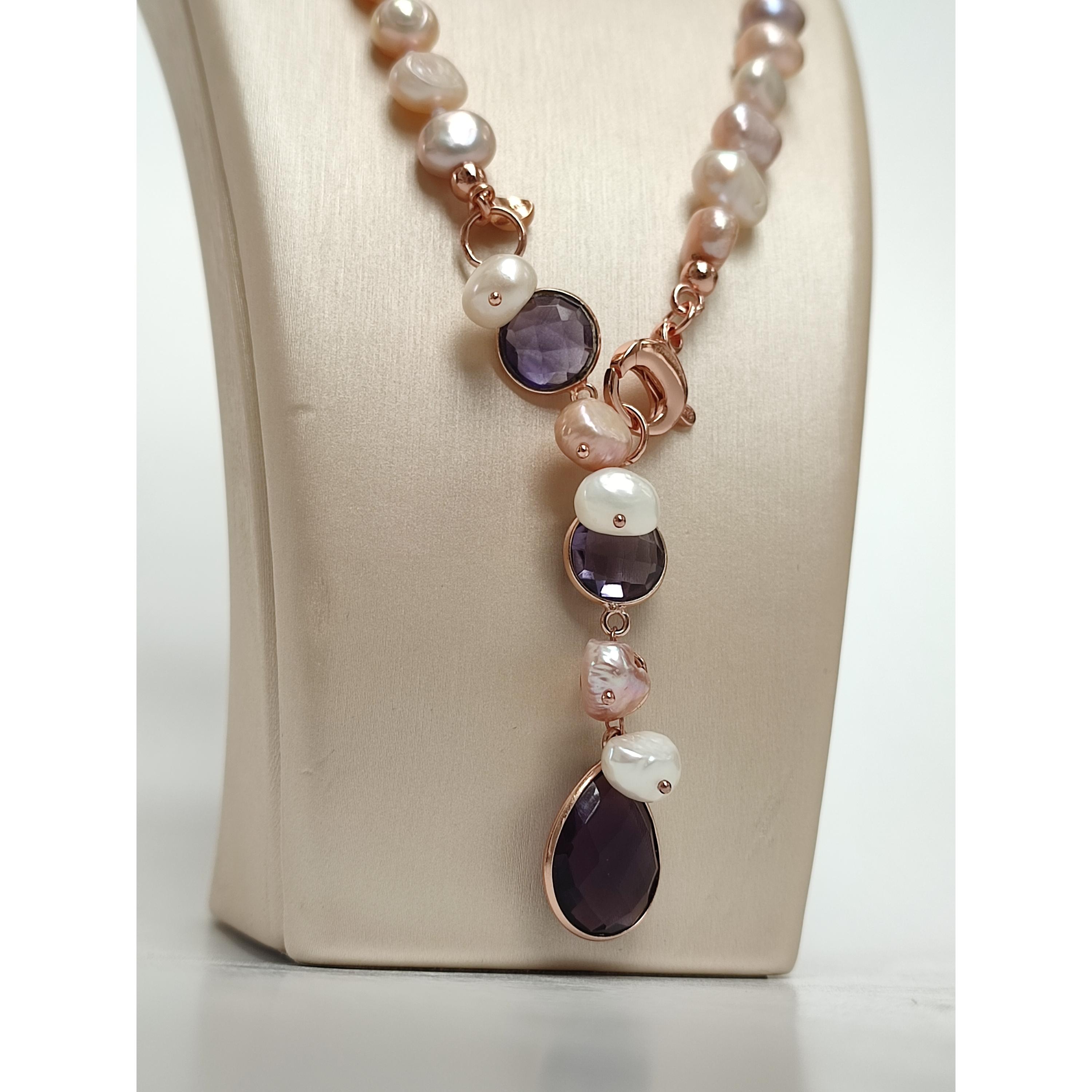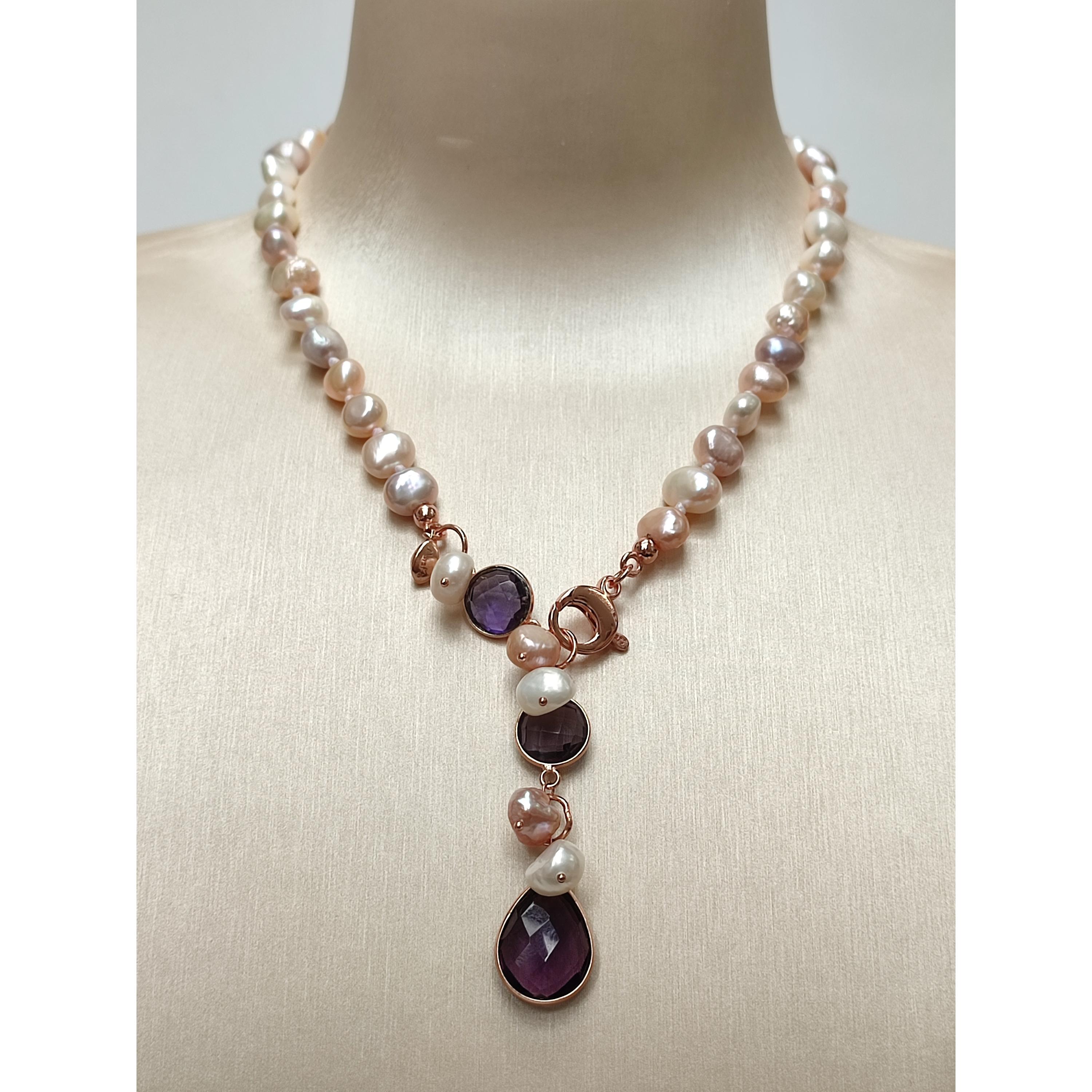 Choker din perle de cultură multicolore neuniforme, cu sfere de 6 – 7 mm și ametist.