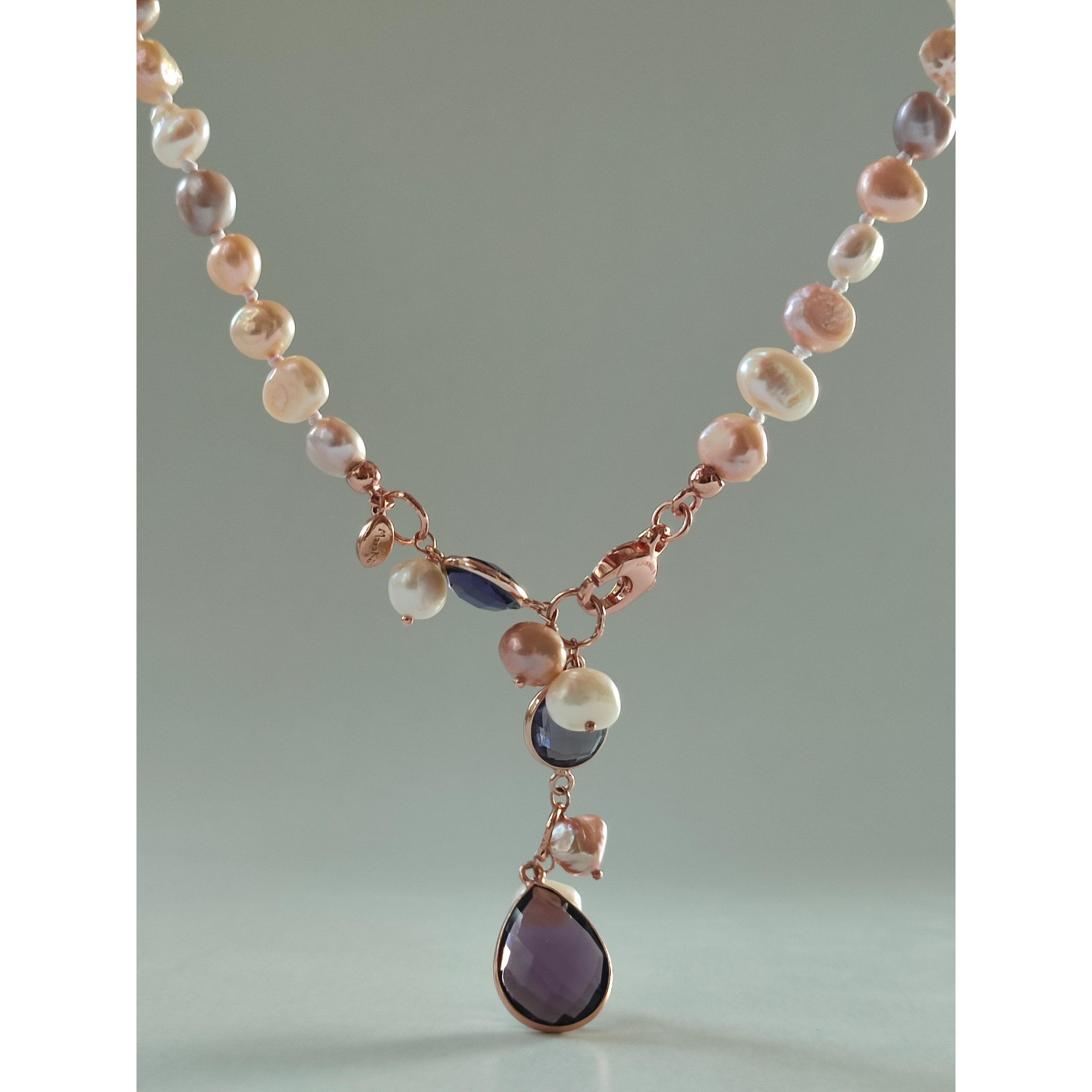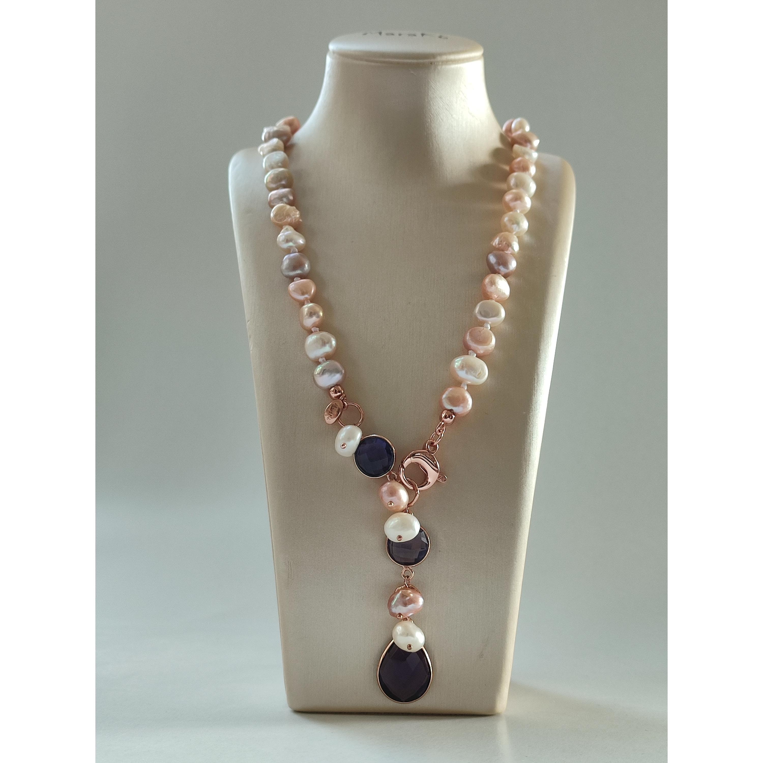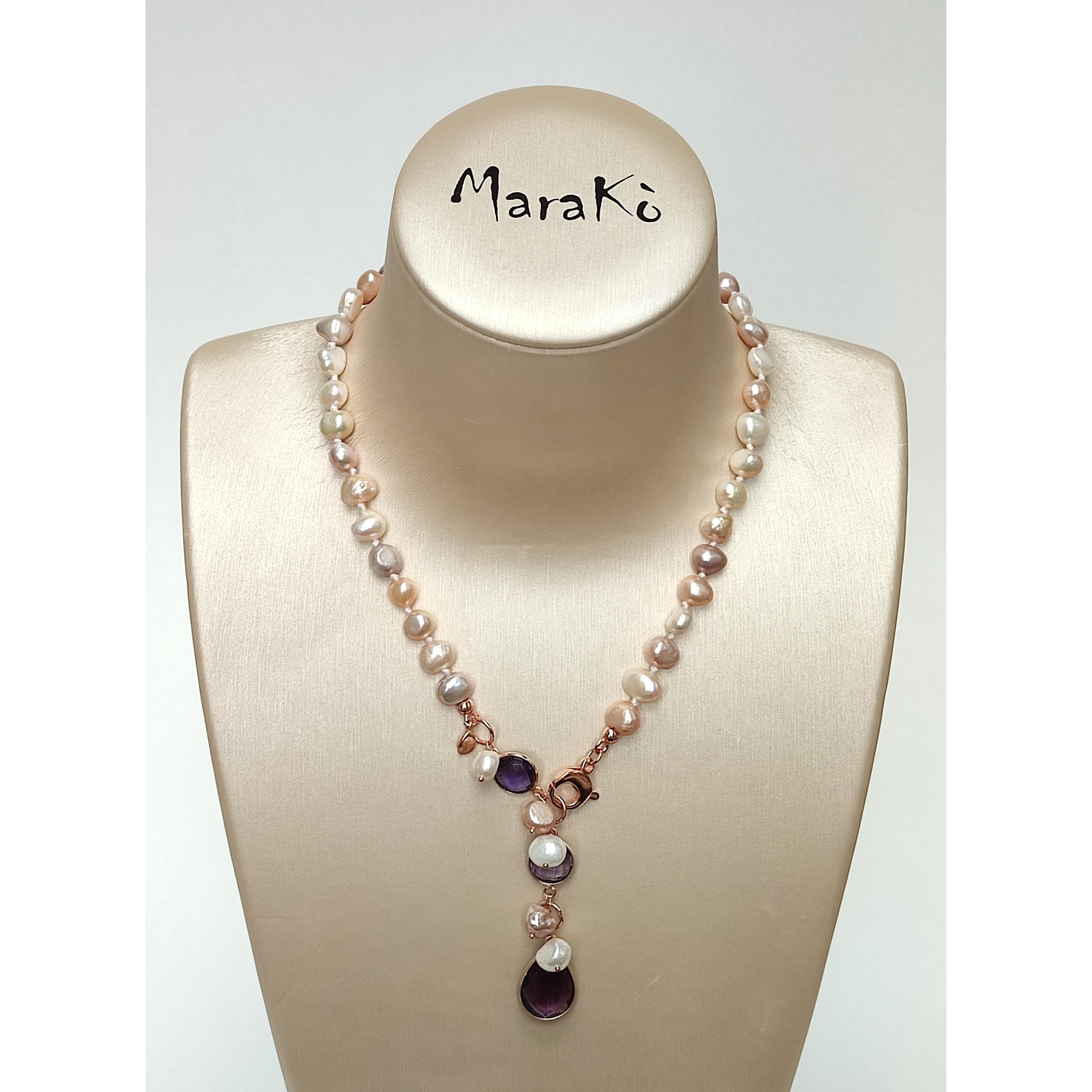Choker din perle de cultură multicolore neuniforme, cu sfere de 6 – 7 mm și ametist.