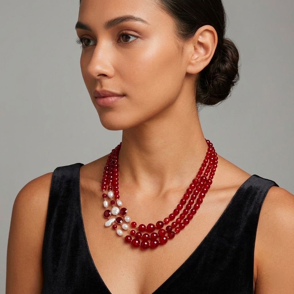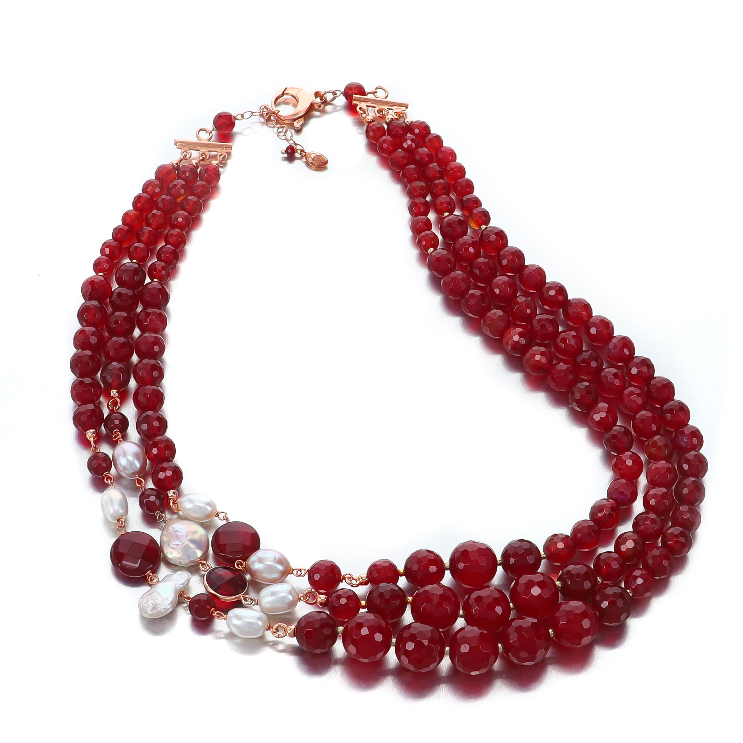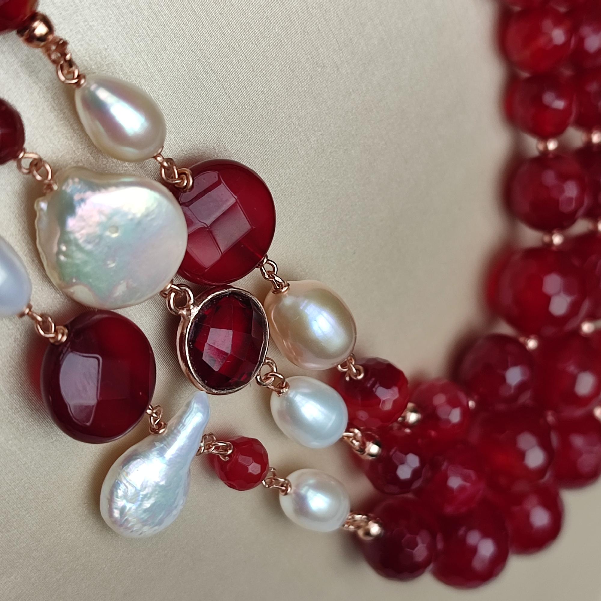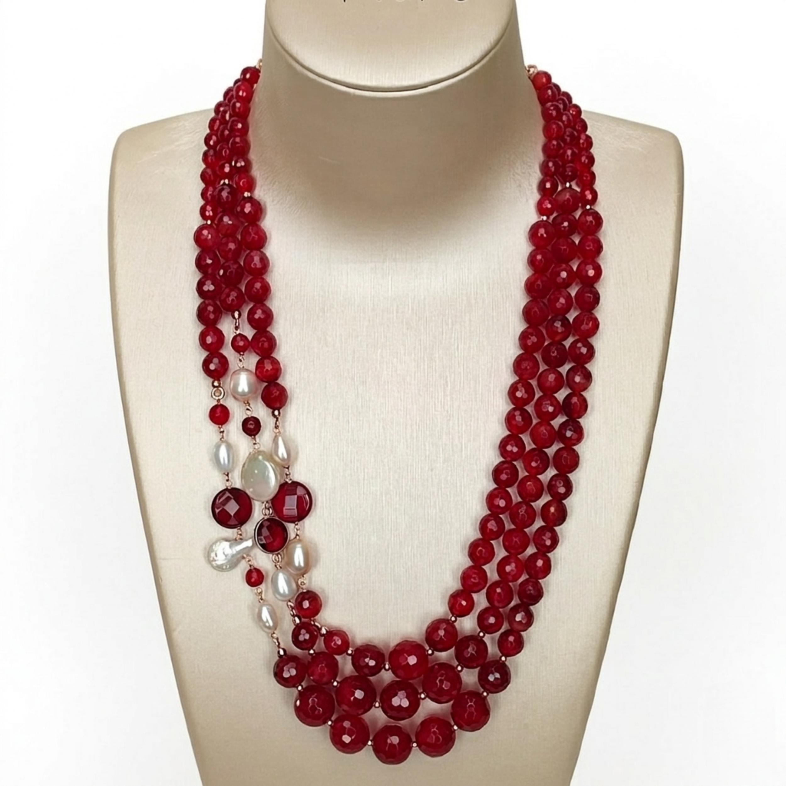 Colier cu trei șiraguri din agat rubiniu fațetat, graduat, cu sfere de 6, 8, 10 și 12 mm și perle de cultură.