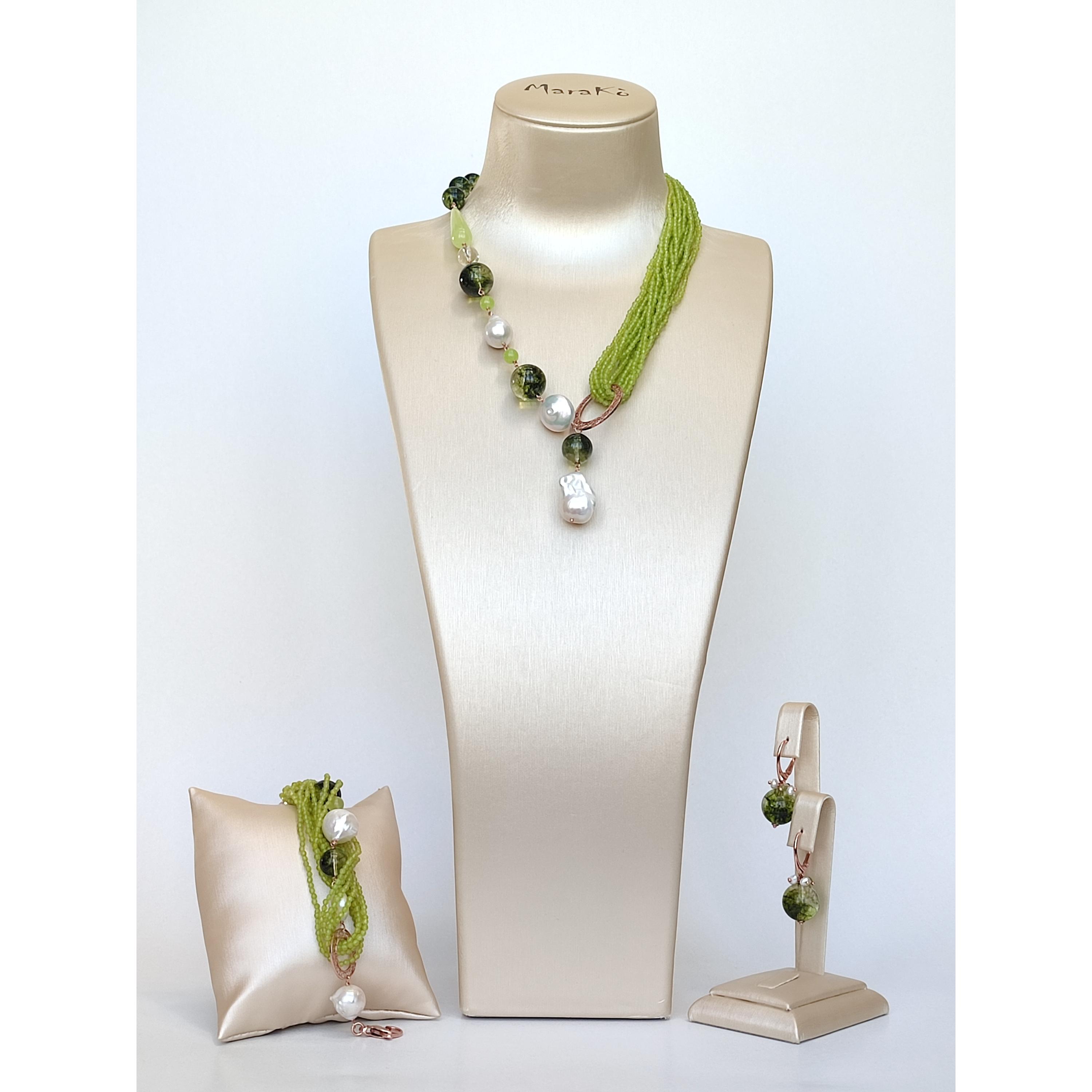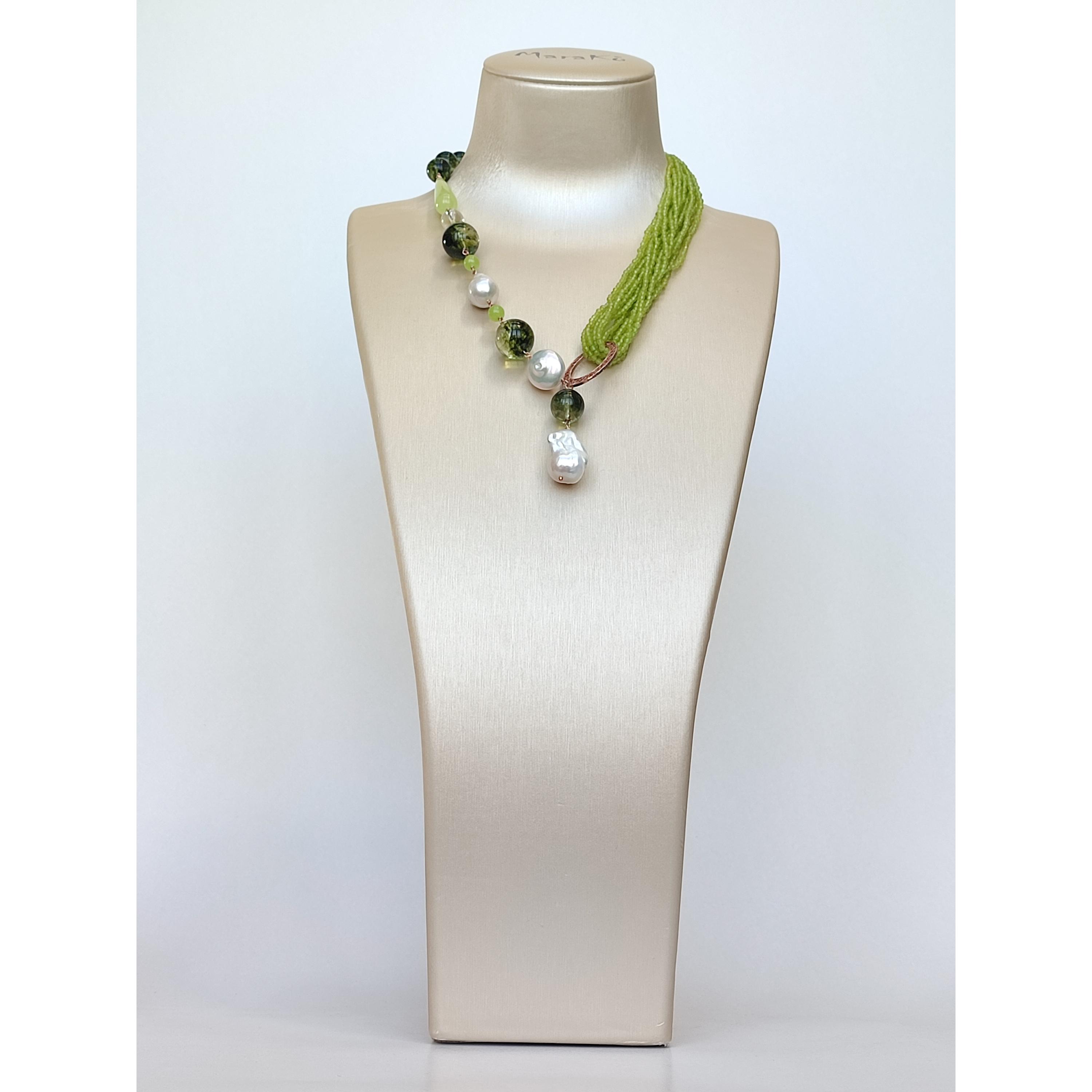 Colier (torchon, la baza gâtului) cu multe șiraguri din cuarț verde, jad olive și perle baroc.