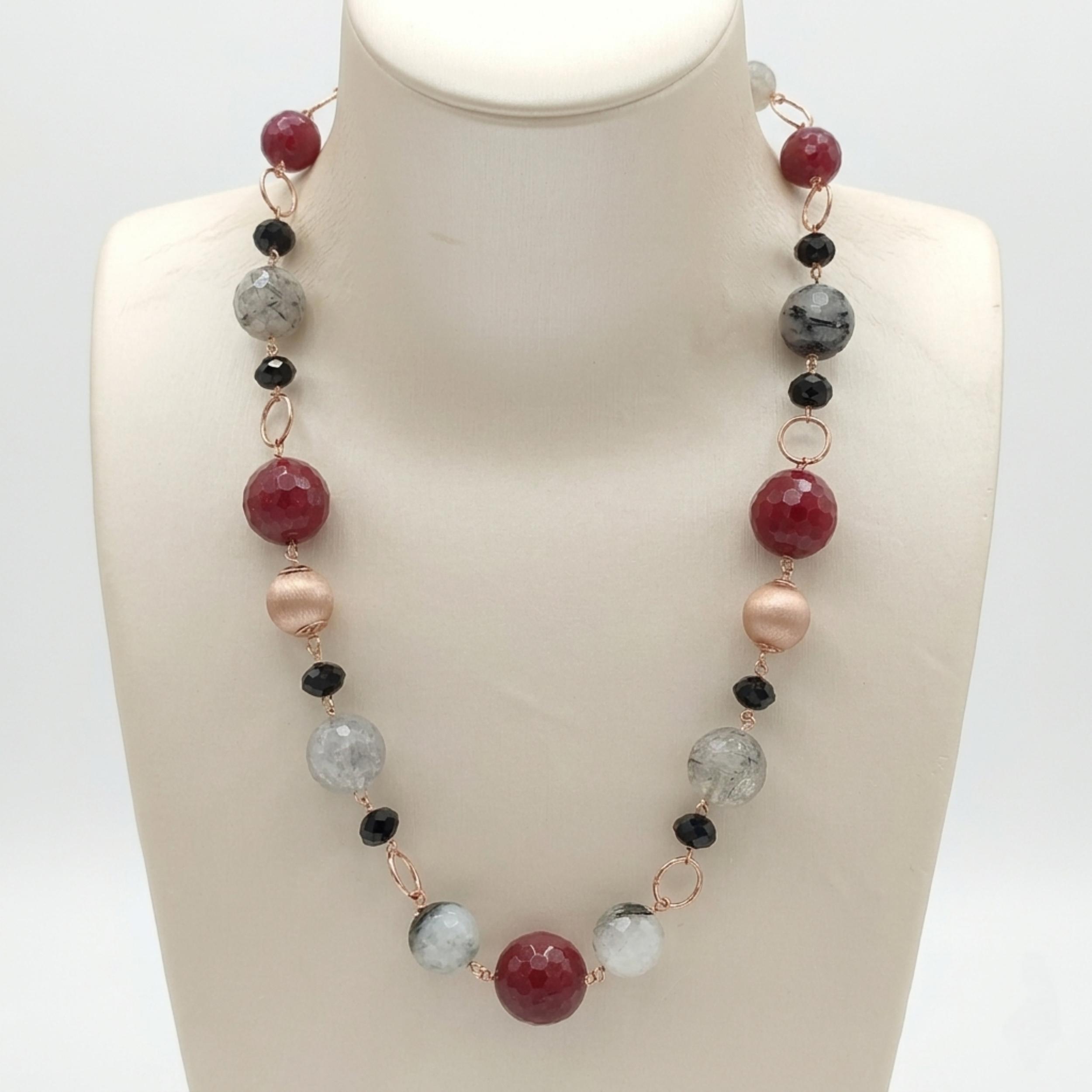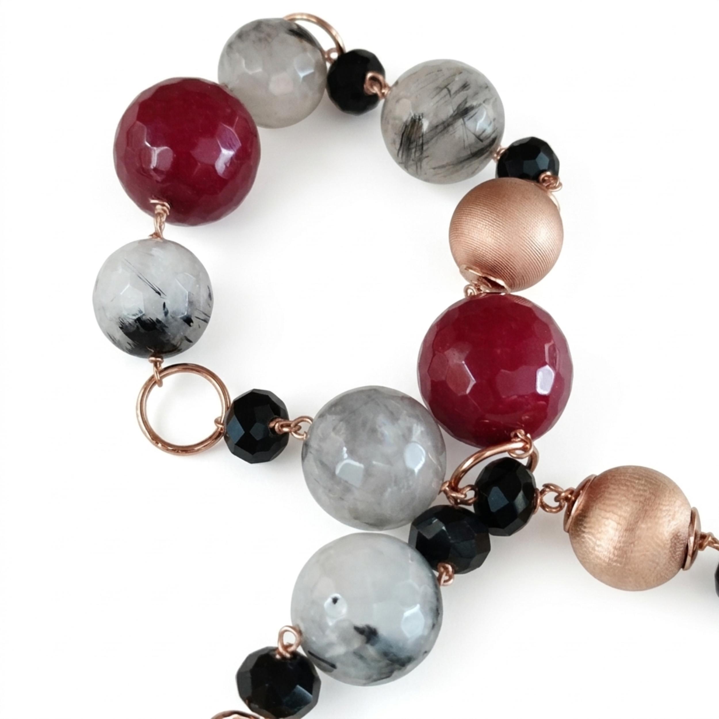 Colier din cuarț rutilat gri, agat rubiniu și agat negru.