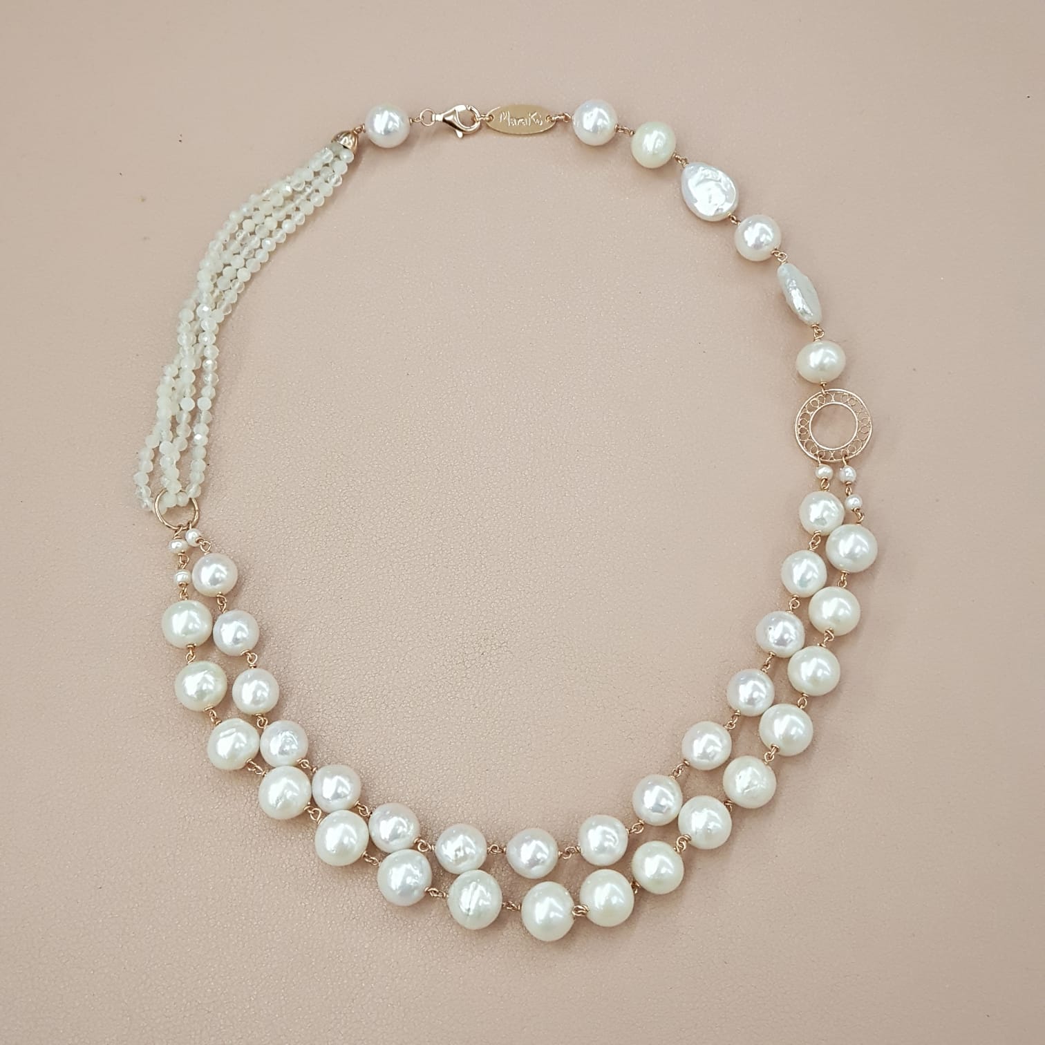 Colier din perle de cultură albe, cu sfere de 10 și 11 mm și labradorit alb cu sfere de 2.5 mm.