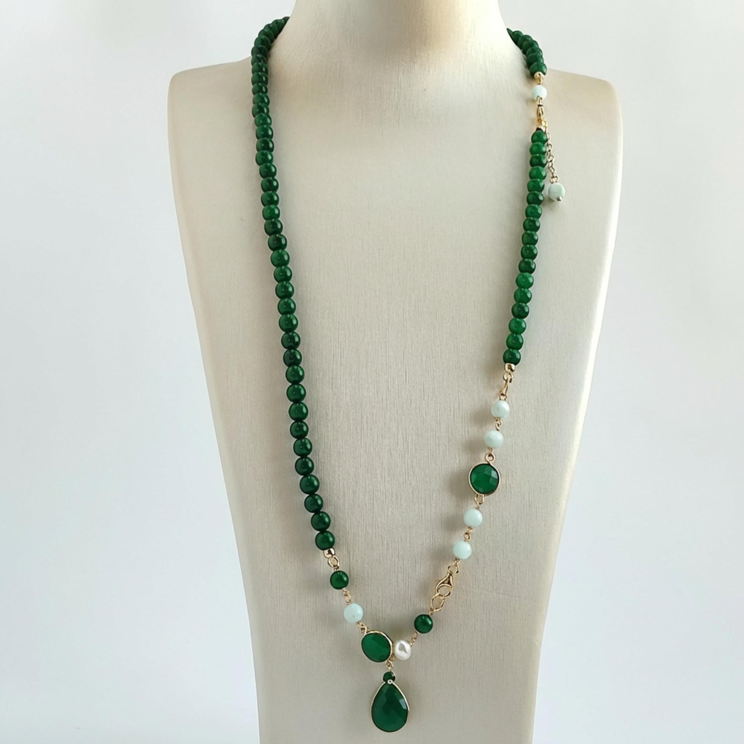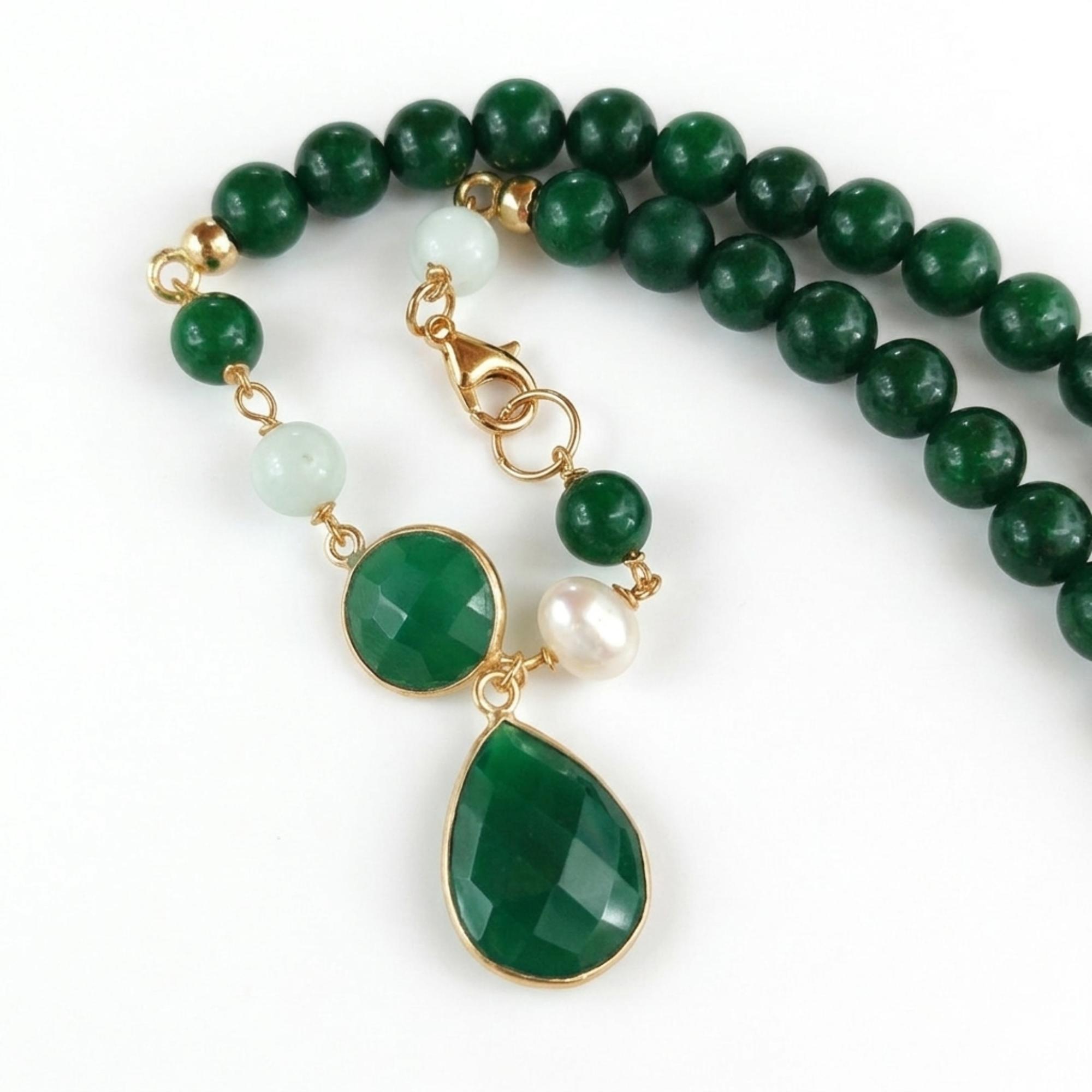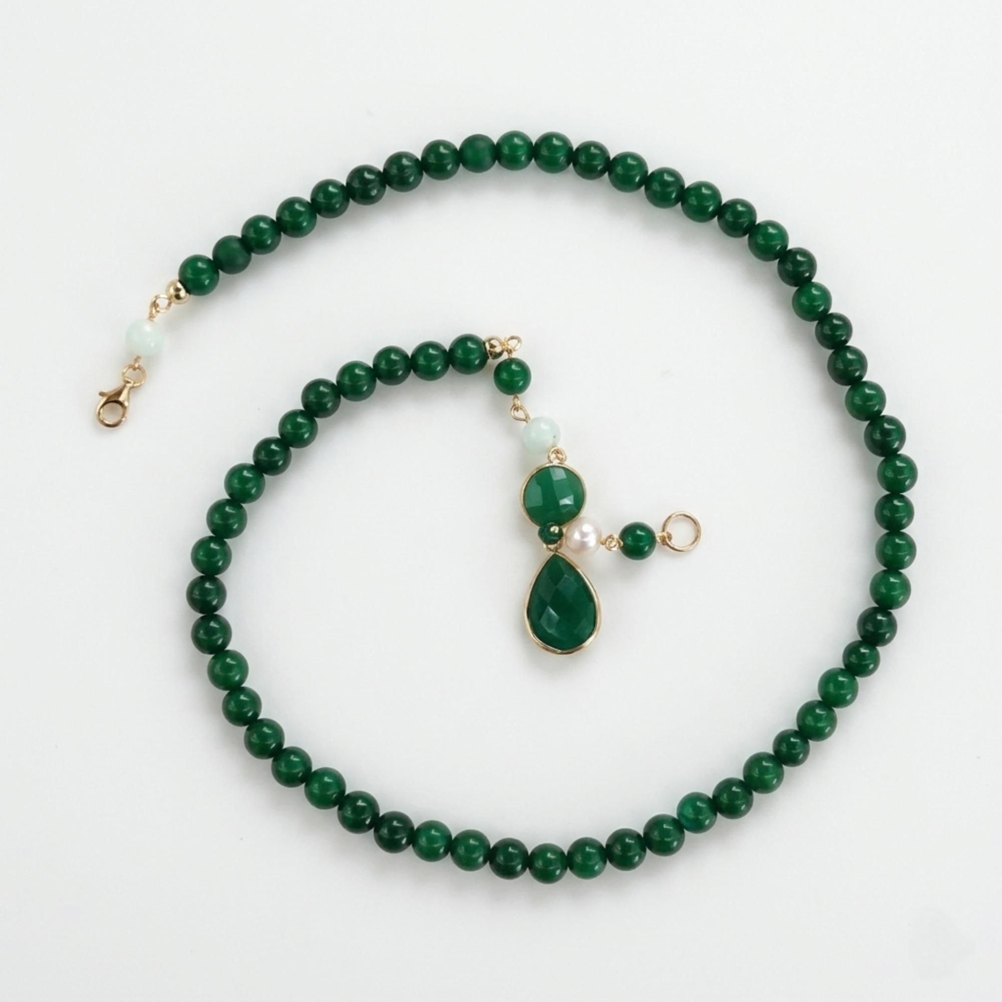 Colier din agat verde smarald cu sfere de 6 mm, diaspor verde, cuarț verde hidrotermal și perlă.