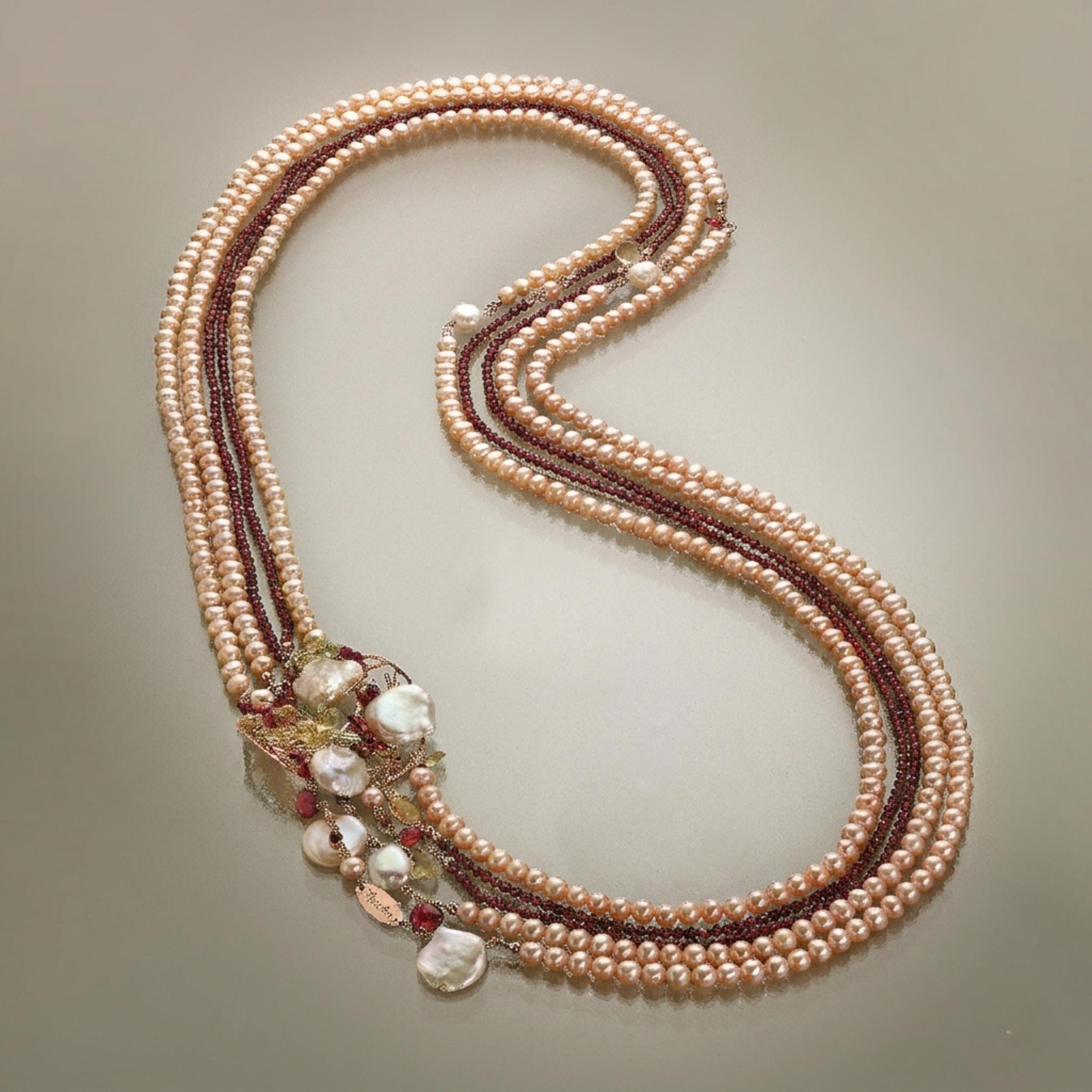 Colier Remarkable din perle, granat, cuarț și citrin.