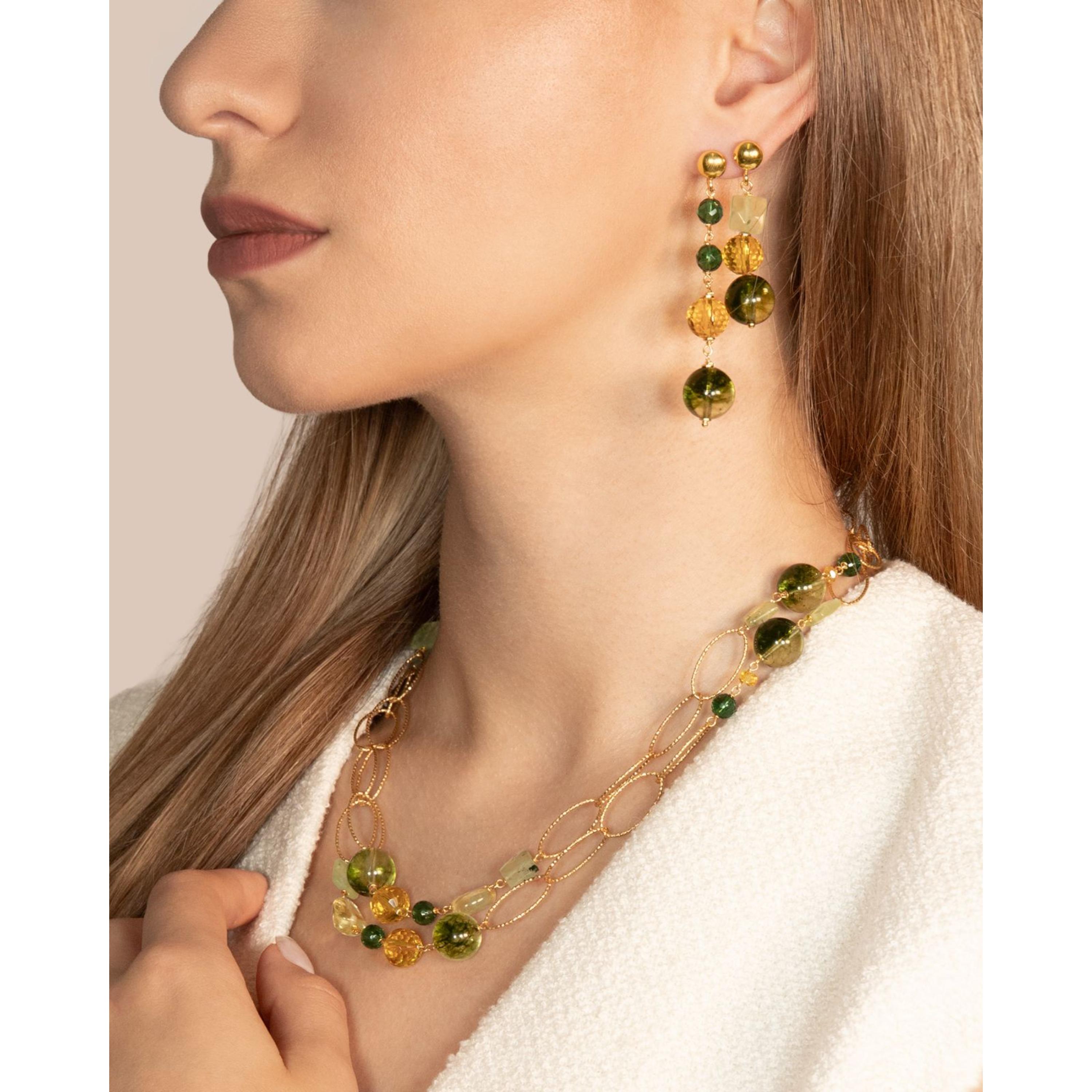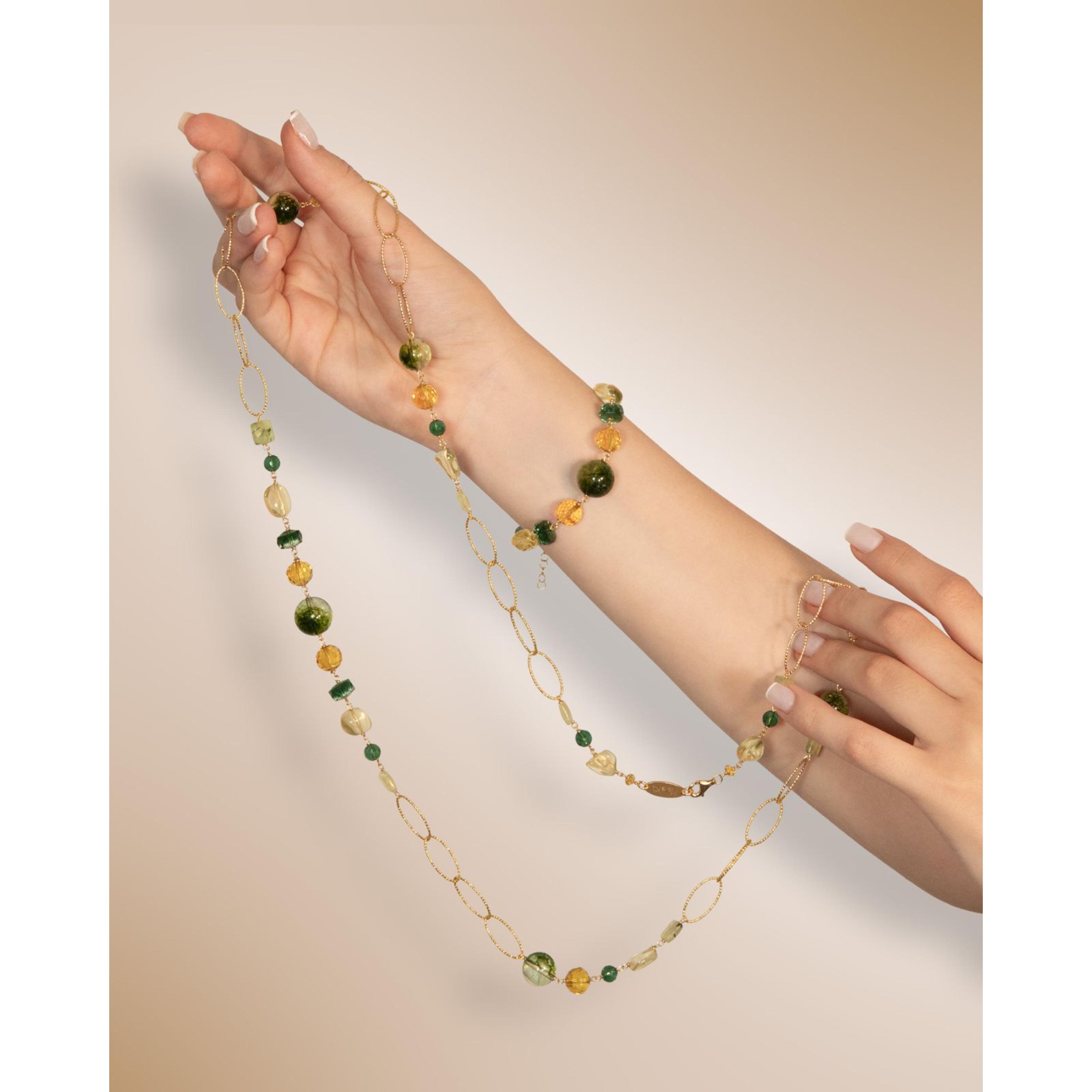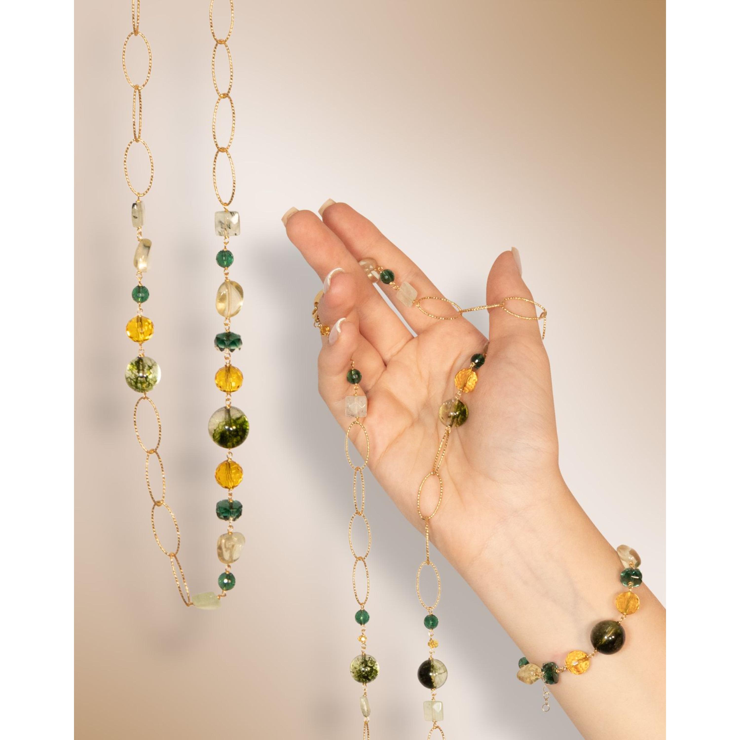 Colier lung cu lanț strălucitor din argint placat cu aur roz, cuarț mușchi, cuarț rutilat verde, cuarț citrin și citrin.