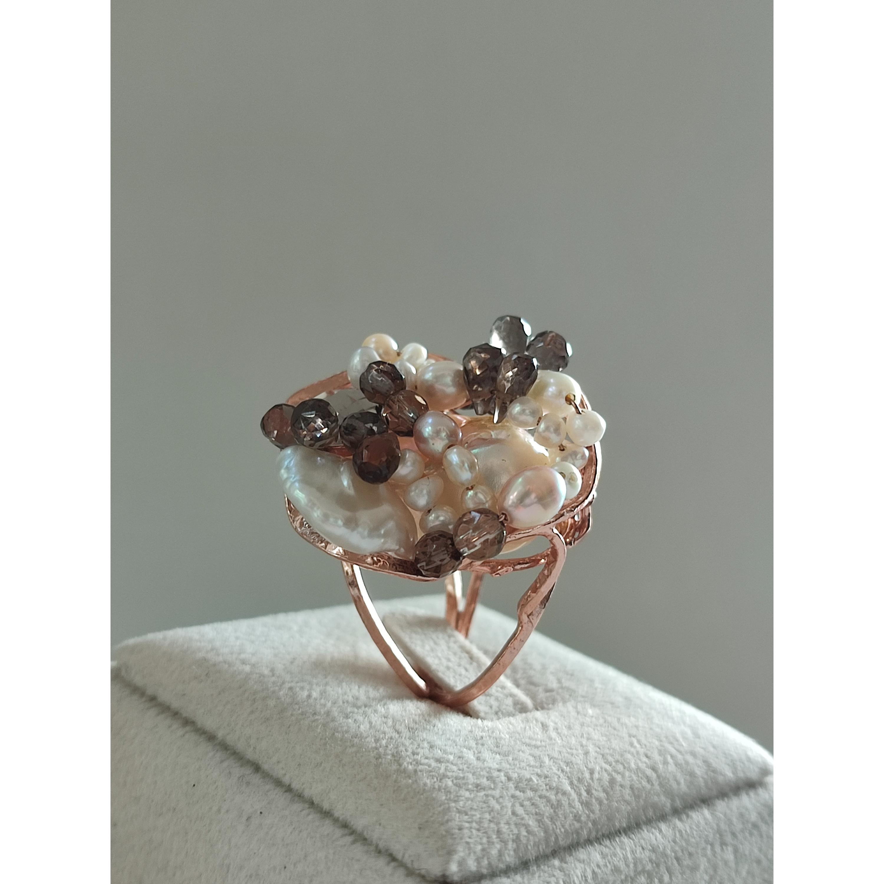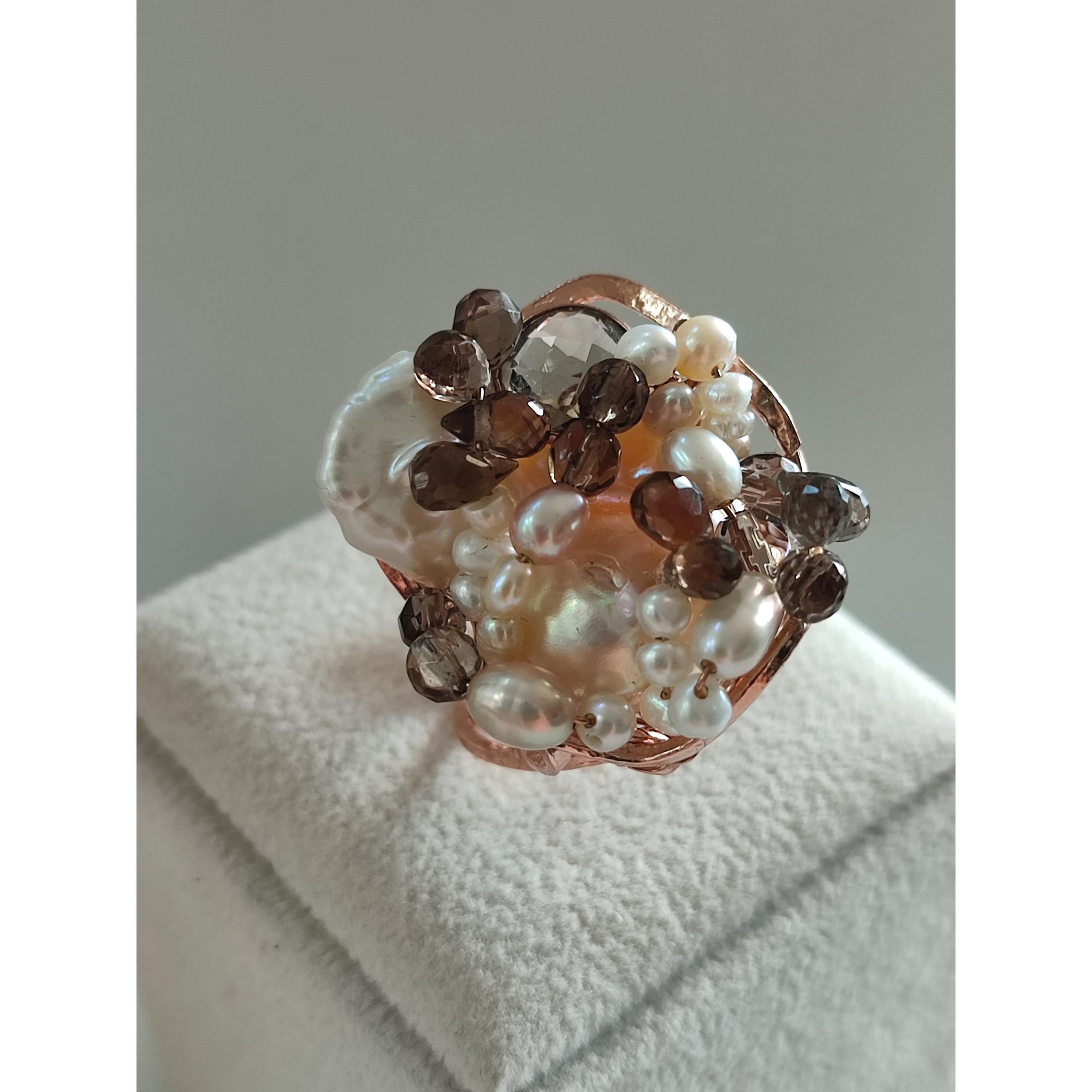 Inel cu o bază neregulată, distinctivă, din argint placat cu aur roz. Perle de cultură luminoase și cuarț fumuriu. Perlă baroc centrală de culoare roz somon.  Dimensiune larg ajustabilă.