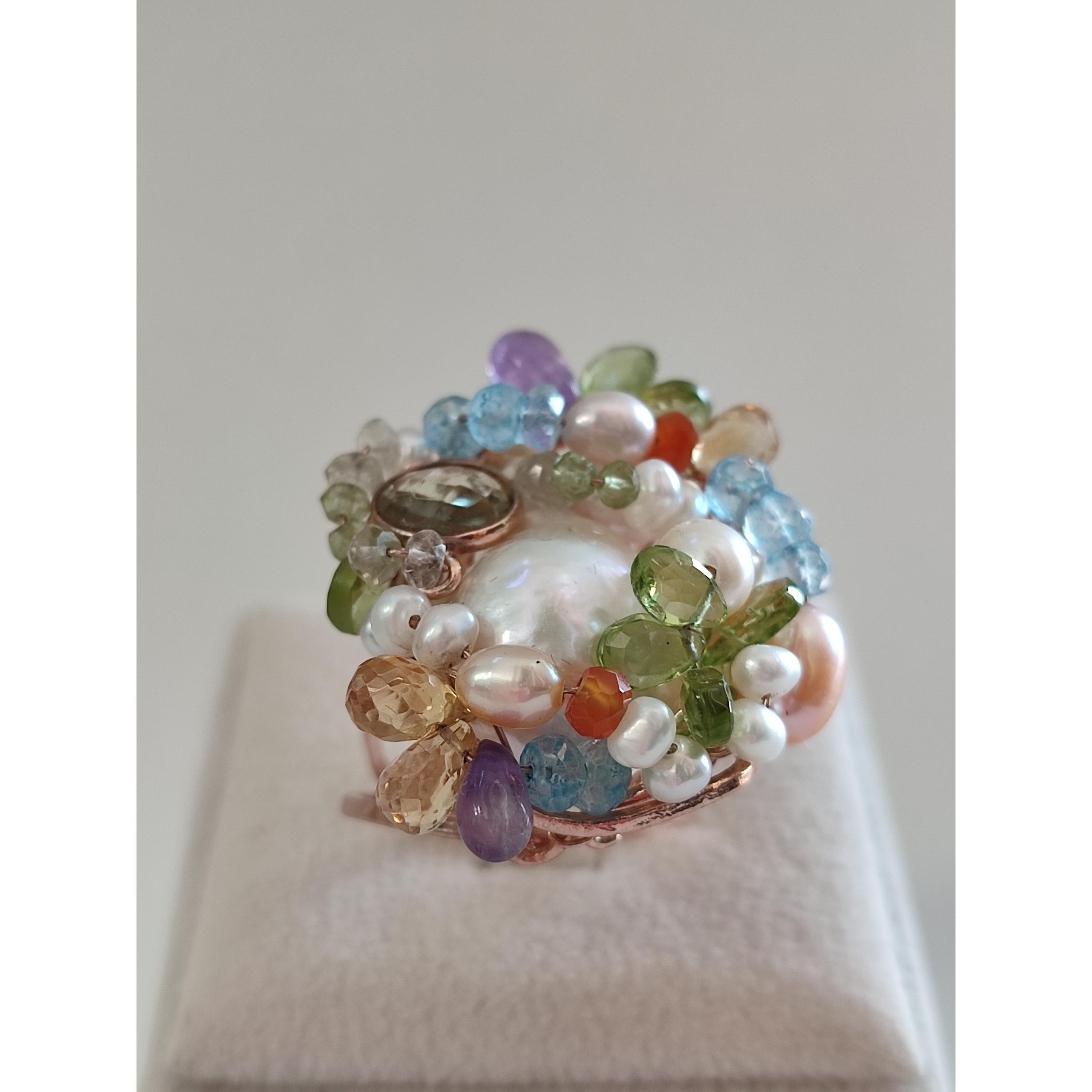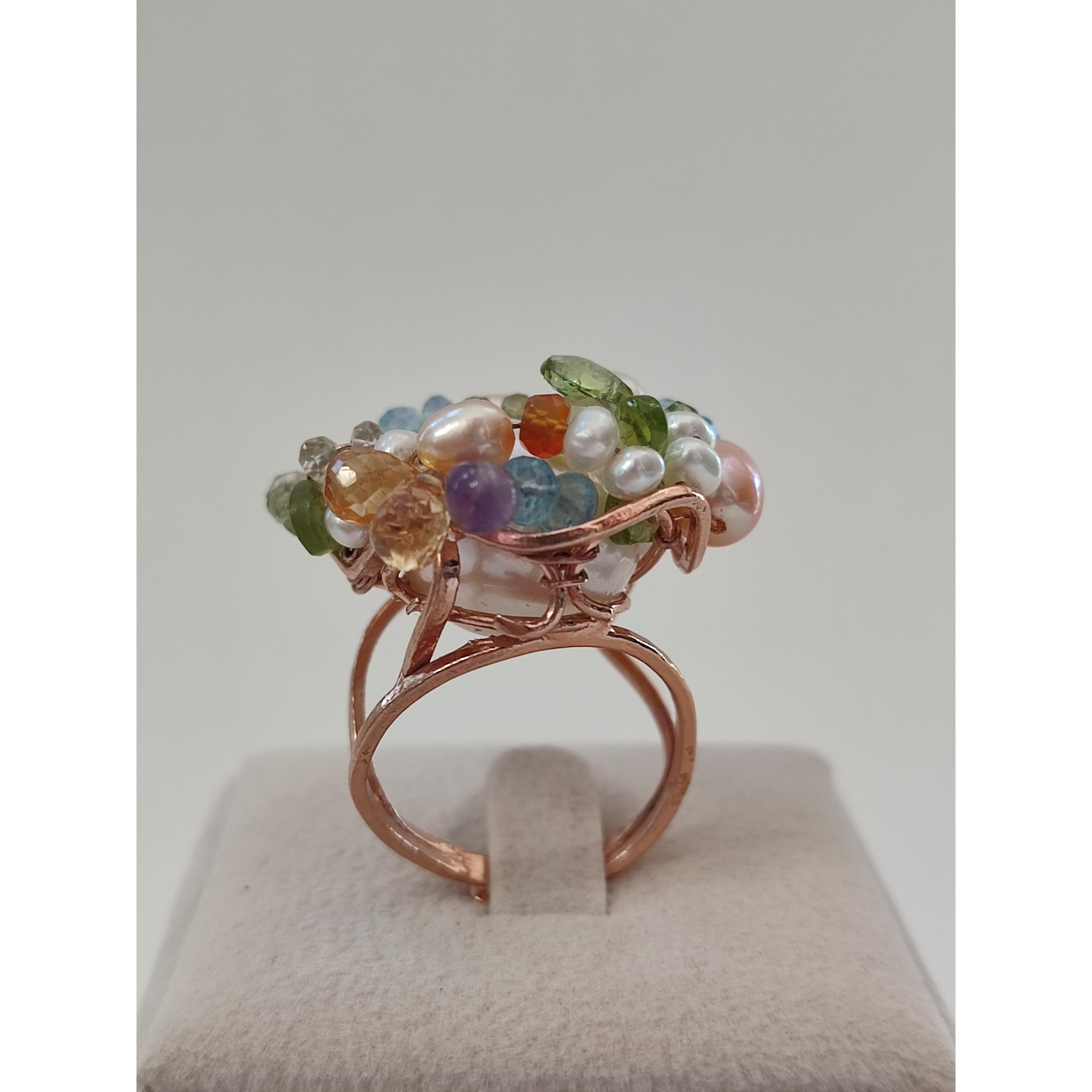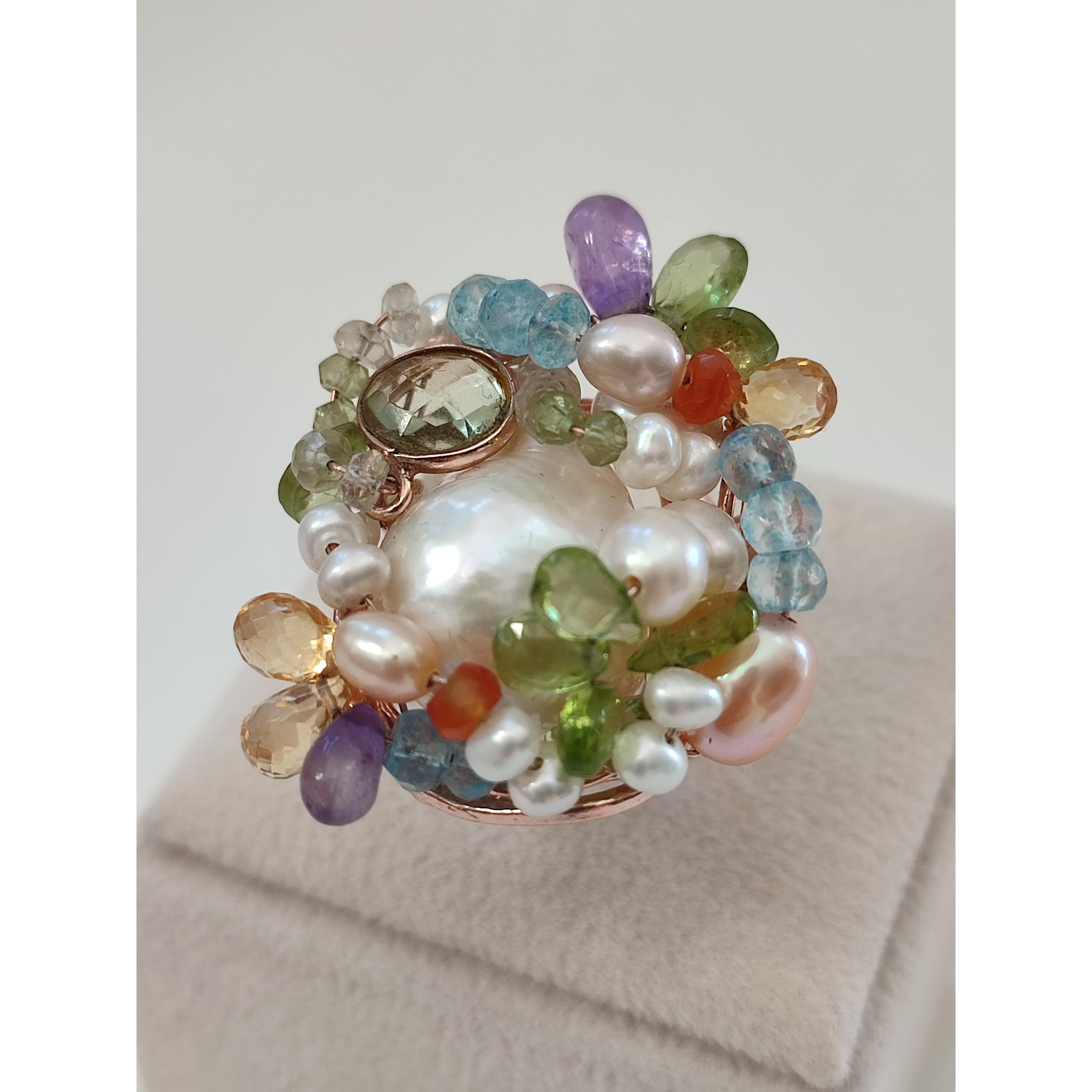 Inel strălucitor și colorat, cu o bază neuniformă specială, din argint placat cu aur roz. Acvamarin, cuarț citrin, picături de peridot, ametist și cornalină. Perlă baroc centrală. Dimensiune larg ajustabilă.