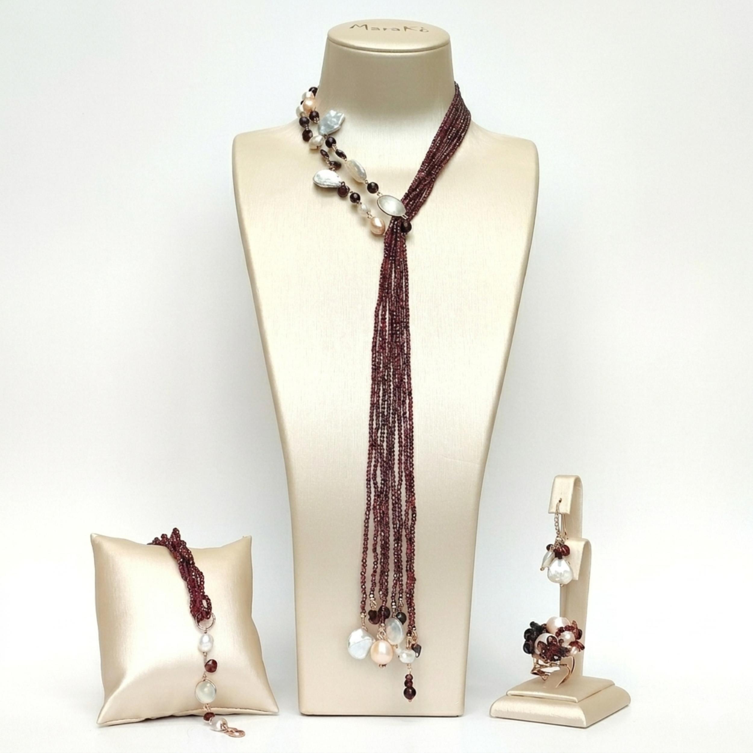 Set Baroque din granat și perle de cultură, compus din: colier, brățară, inel și cercei.