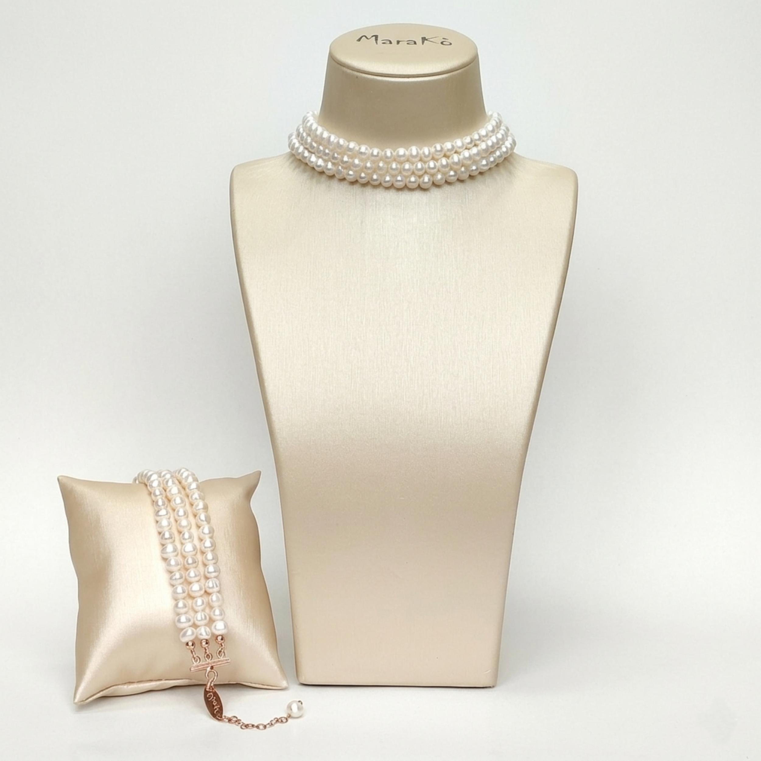 Choker cu trei șiraguri de perle de cultură able, strălucitoare și elegante, cu lanț auriu, reglabil.