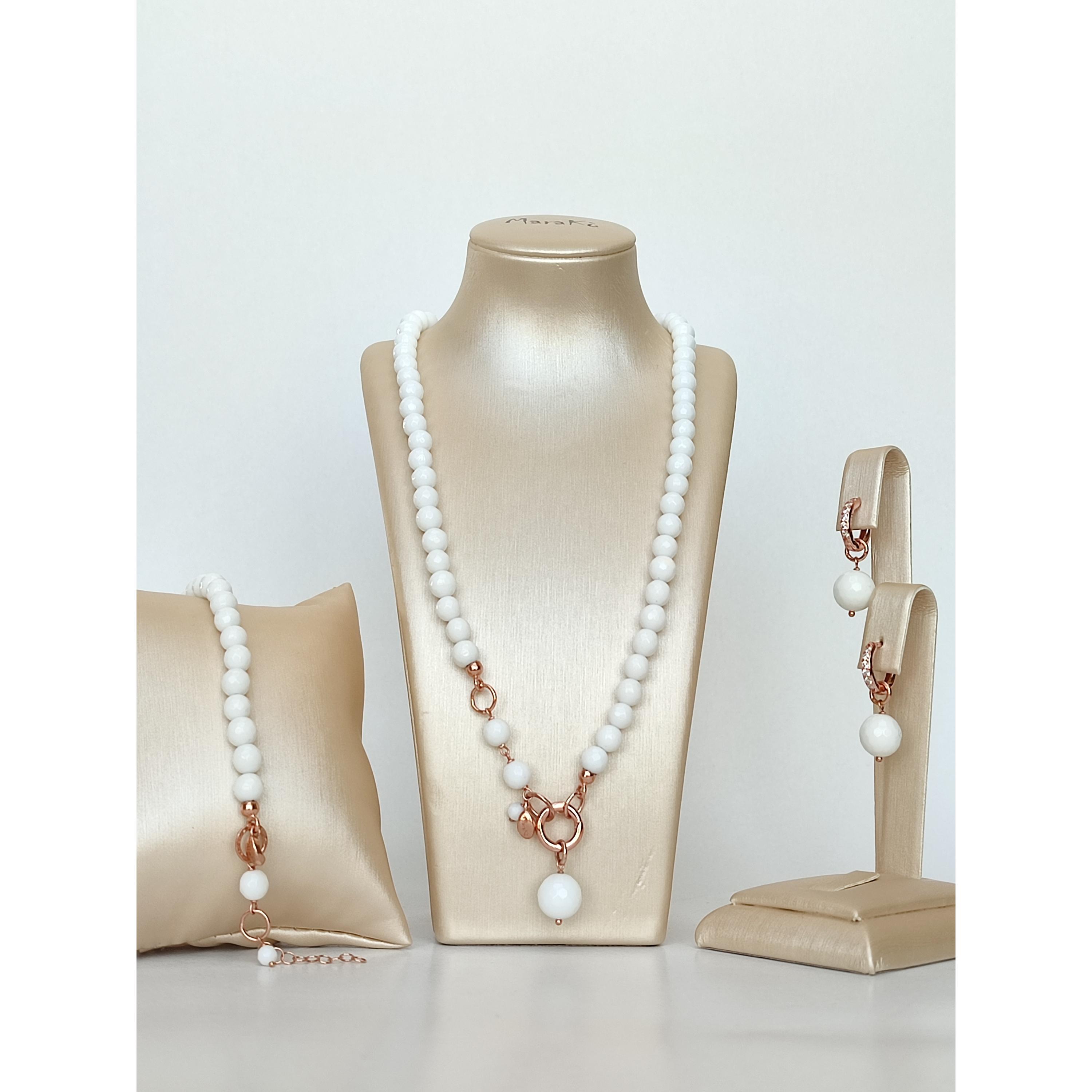 Cercei inelari cu zirconiu cubic, argint placat cu aur roz și pandantive detașabile din agat alb, cu sfere de 10 mm;