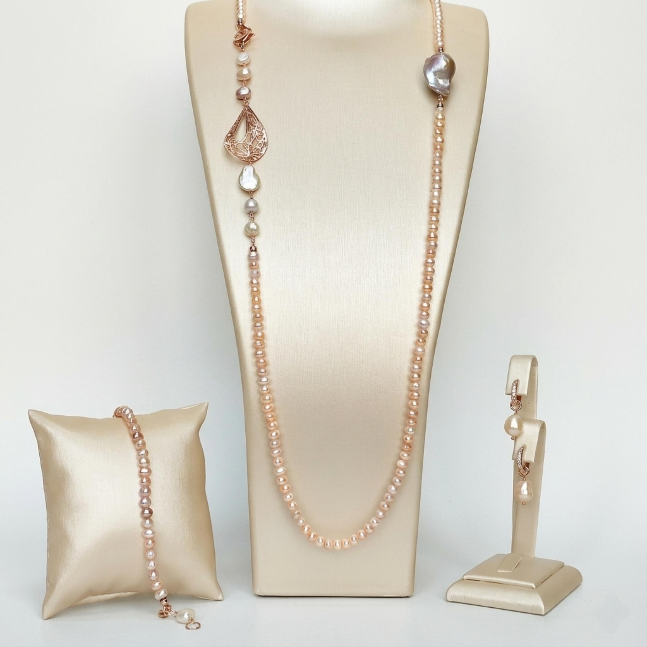 Set Fantasy din perle de cultură roz multicolore, semirotunde, compus din: colier, brățară și cercei.