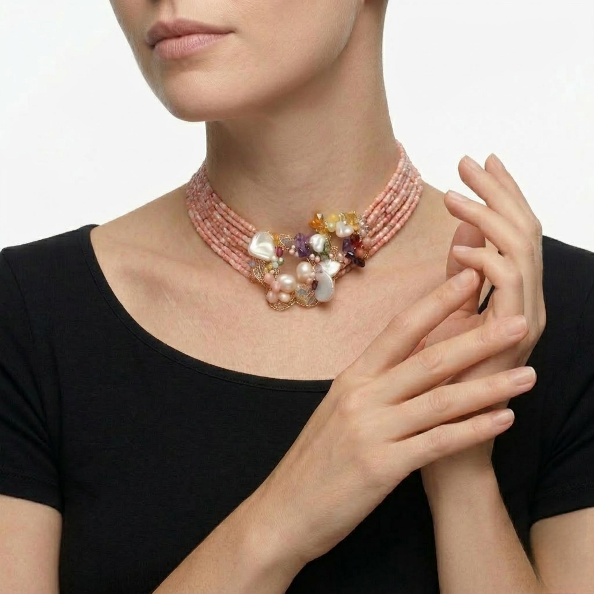 Choker Rainbow cu șiraguri din opal roz tăiat cu diamantul și cuarț multicolor, cu sfere de 2 mm.
