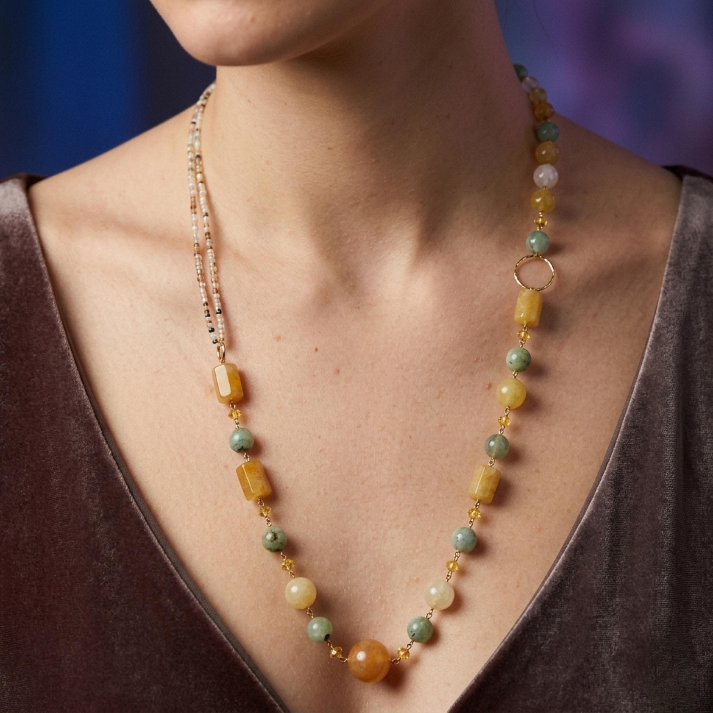 Colier Venera din opal galben cu sfere de 2 mm, agat galben, cuarț rutilat verde și cuarț galben hidrotermal.